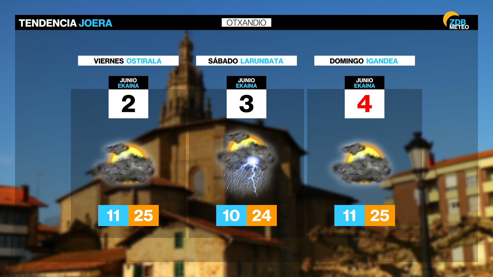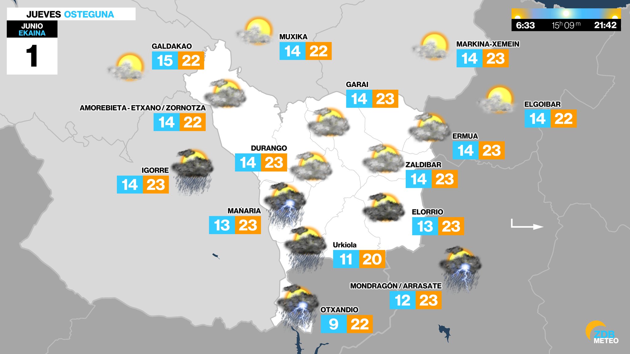 EGURALDIA | El jueves los chubascos podrían alcanzar más zonas. Aumentará algo la nubosidad, incluso por la mañana, cuando no se descarta algún chubasco ocasional. Por la tarde aumentará la inestabilidad y de nuevo se darán chubascos de carácter tormentoso, que esperamos que sean más generalizados que en jornadas anteriores. Las temperaturas tenderán a descender. Viento de componente oeste por la mañana y de componente este por la tarde.