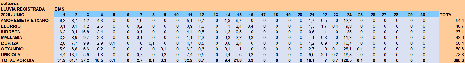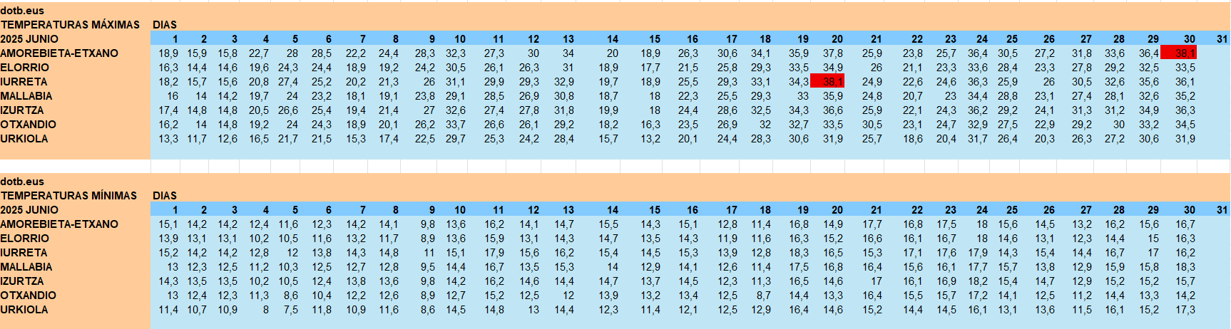 DURANGALDEA | Según los registros, durante los meses de junio de años anteriores (2023 y 2024) no se habían registrado temperaturas tan elevadas como este año, llegando a 38,1 grados durante dos días. Las máximas en 2023 en el mes de junio fue de 30,5 y en 2024 de 31,5 en 2023.