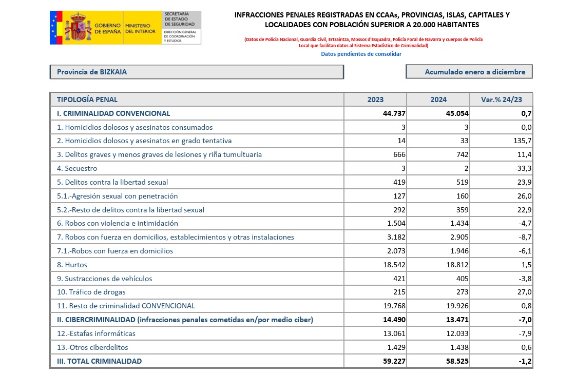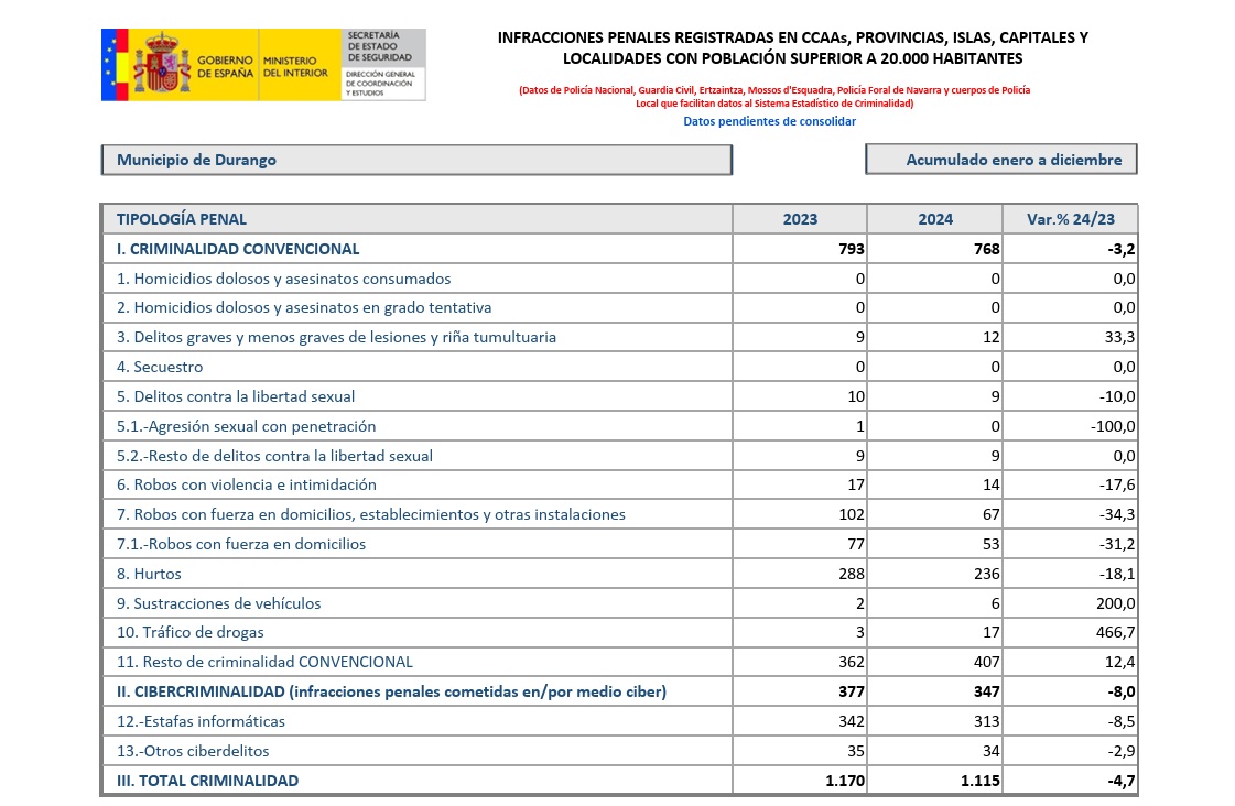 Días después, el pasado jueves, el Ministerio de Interior publicó los datos de criminalidad correspondiente al pasado año por comunidades autónomas, territorios y municipios con más de 20.000 habitantes, entre los que se encuentra Durango.