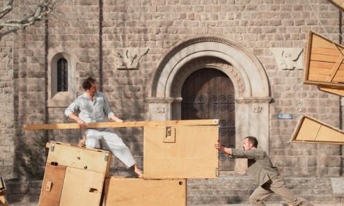 Espectáculo-instalación que muestra el proceso de construcción de un arco gigante de cajas pesadas utilizando como premisa la economía de esfuerzo y de movimiento y sirviéndose de tecnología ancestral, pero plenamente vigente: la palanca, la rueda…