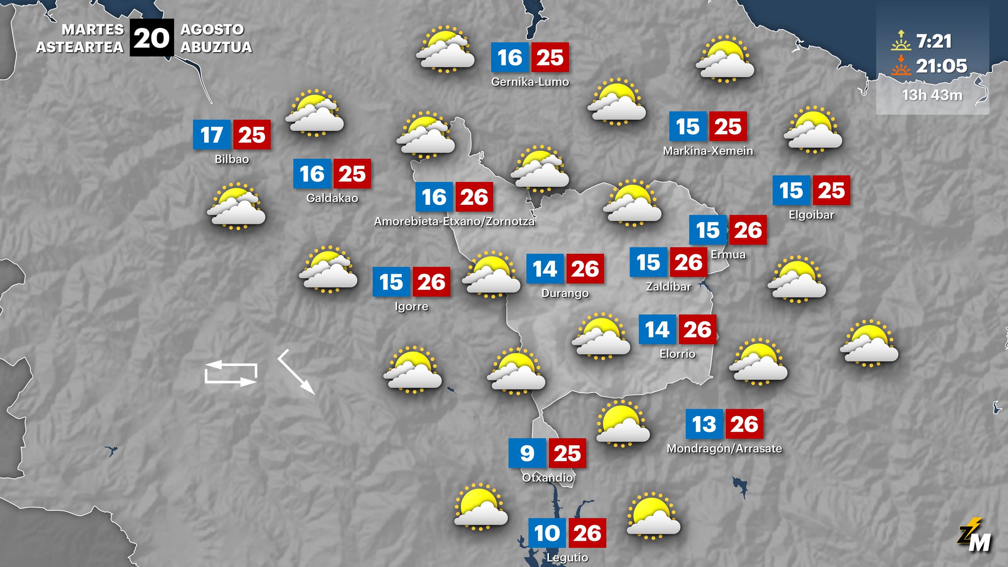 EGURALDIA | Más nubosidad para el martes. Por la mañana y primeras horas de la tarde el tiempo será todavía soleado, a pesar de algunas nubes bajas. A lo largo de la tarde las nubes bajas irán a más en la mitad norte y al final de la misma se extenderán también a puntos de la mitad sur. Por la noche puede llover en algunos puntos, sobre todo del noroeste. Viento del norte a partir de la mañana, se intensificará por la tarde; por ello, las temperaturas máximas podrían bajar un par de grados, aunque en general seguirán por parecidos derroteros.