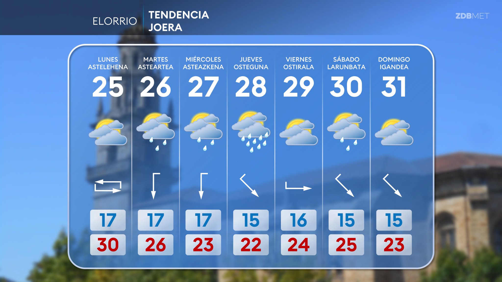 EGURALDIA | Tras un fin de semana veraniego, el tiempo seguirá igual las próximas horas, por lo menos hoy lunes, mañana martes llegarán las nubes y de los 30 grados de hoy se bajarán a los 25 grados los próximos días. Además, aunque poco, también se esperan algunas lluvias.