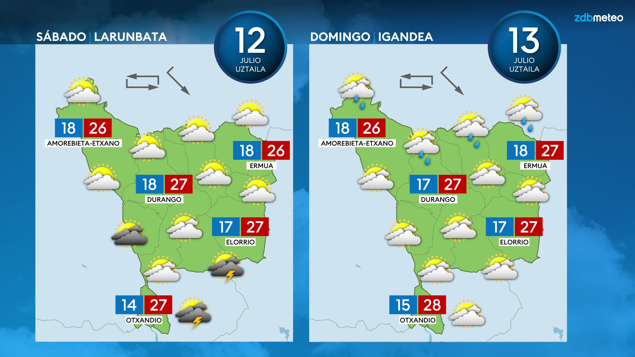 Hoy sábado se mantiene la inestabilidad y la probabilidad de tormentas. Las tormentas serán más probables de madrugada y durante la segunda mitad del día. Mientras que la mañana podría ser el momento más tranquilo del día, aunque se podrían producir algunos chubascos, que serían más dispersos y de menor entidad. Por la tarde regresarán las tormentas, sobre todo a Araba y a Navarra, donde podrían ser localmente fuertes. Las temperaturas máximas se resentirán ligeramente. El viento soplará de componente oeste en la costa; hacia el interior lo hará de dirección variable al comienzo, pasando a soplar de componente norte por la tarde. En zonas de tormenta las rachas de viento podrán ser intensas.