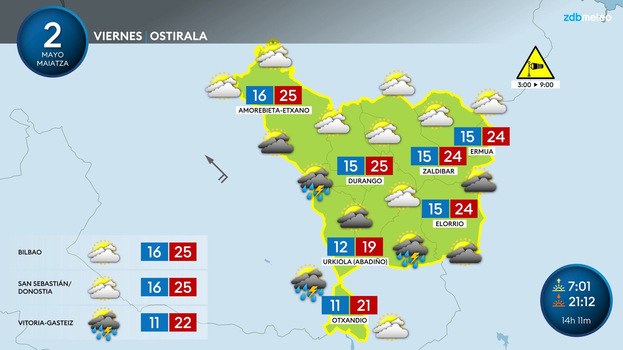 EGURALDIA | Las altas temperaturas de estos días seguirán siendo protagonistas este viernes y el sábado, con la posibilidad de tormentas durante ambos días. El domingo, sin embargo, será más gris, con cielos cubiertos y ambiente más fresco, pasando de los 25 del sábado a los veinte.