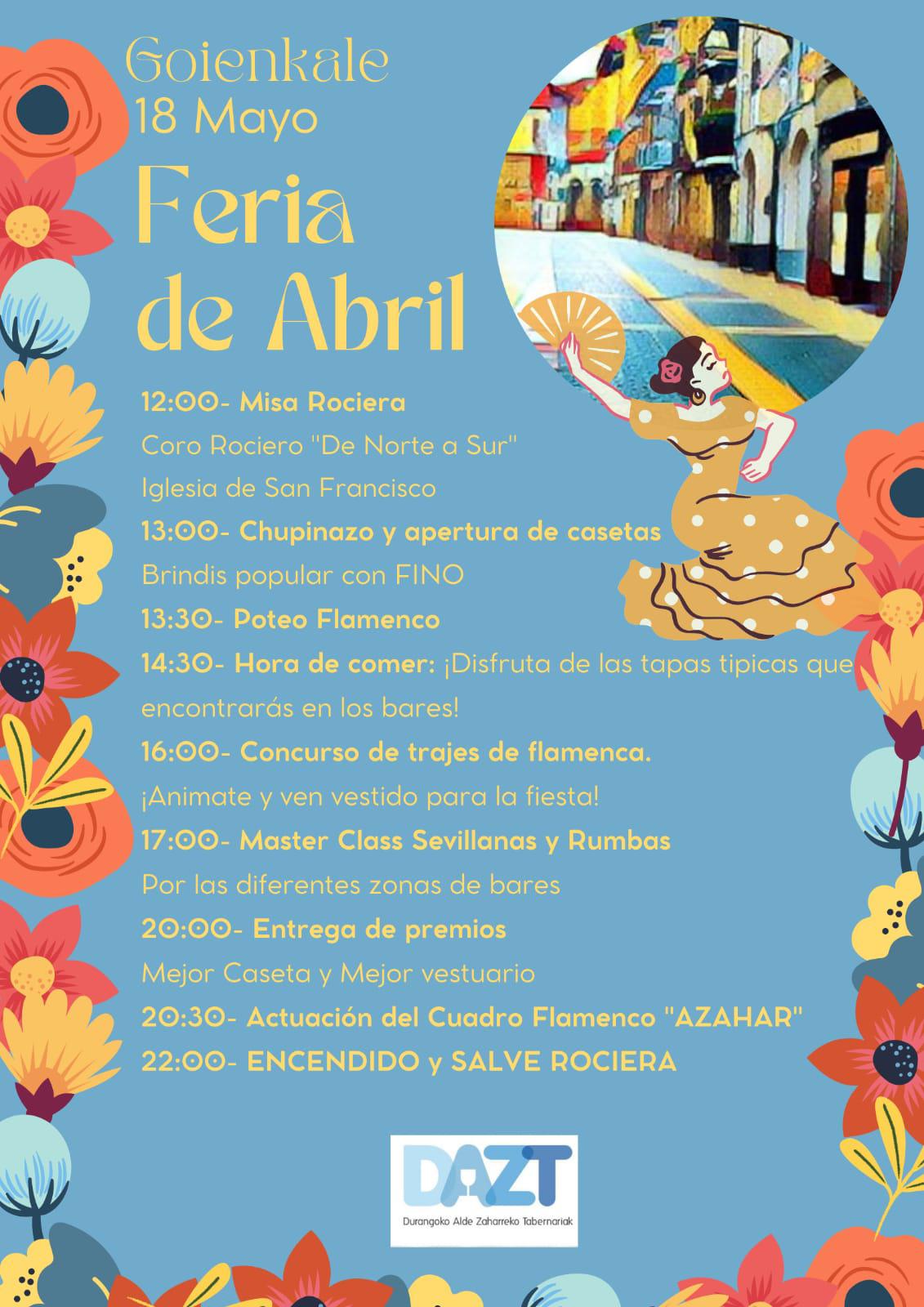 DURANGO | Este próximo sábado, 18 de mayo, Goienkale celebra su Feria de Abril organizado por Durangoko Alde Zaharreko Tabernariak DAZT. Desde primera hora de la mañana se han organizado actos que finalizarán a las diez de la noche con el encendido y la salve rociera.