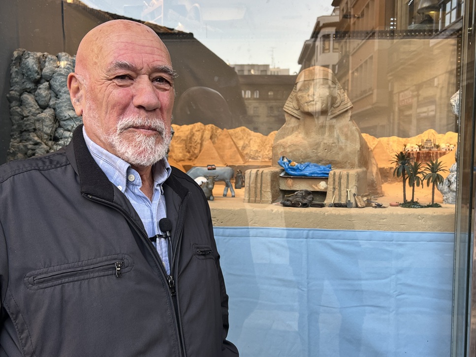 Su último trabajo bautizado como “El descanso en la huida a Egipto”, representa la huída de María y José a Egipto. «He recreado parte de la historia de cuando Herodes quiso matar al niño. Los padres huyeron a Egipto y yo he buscado la forma de expresarlo con las pirámides, El Cairo al fondo, la esfinge y un pequeño oasis que es el desierto, donde las figuras están descansando con unos burros que utilizan ellos para viajar”, describía Ibañez su Belén. “Llevan una pala, una bota de agua y como tenían que comer algo para hacer la travesía de Jerusalén a Egipto les hice un pequeño fuego con un sartén y dos huevos fritos”, añadía entre risas el belenista durangarra.