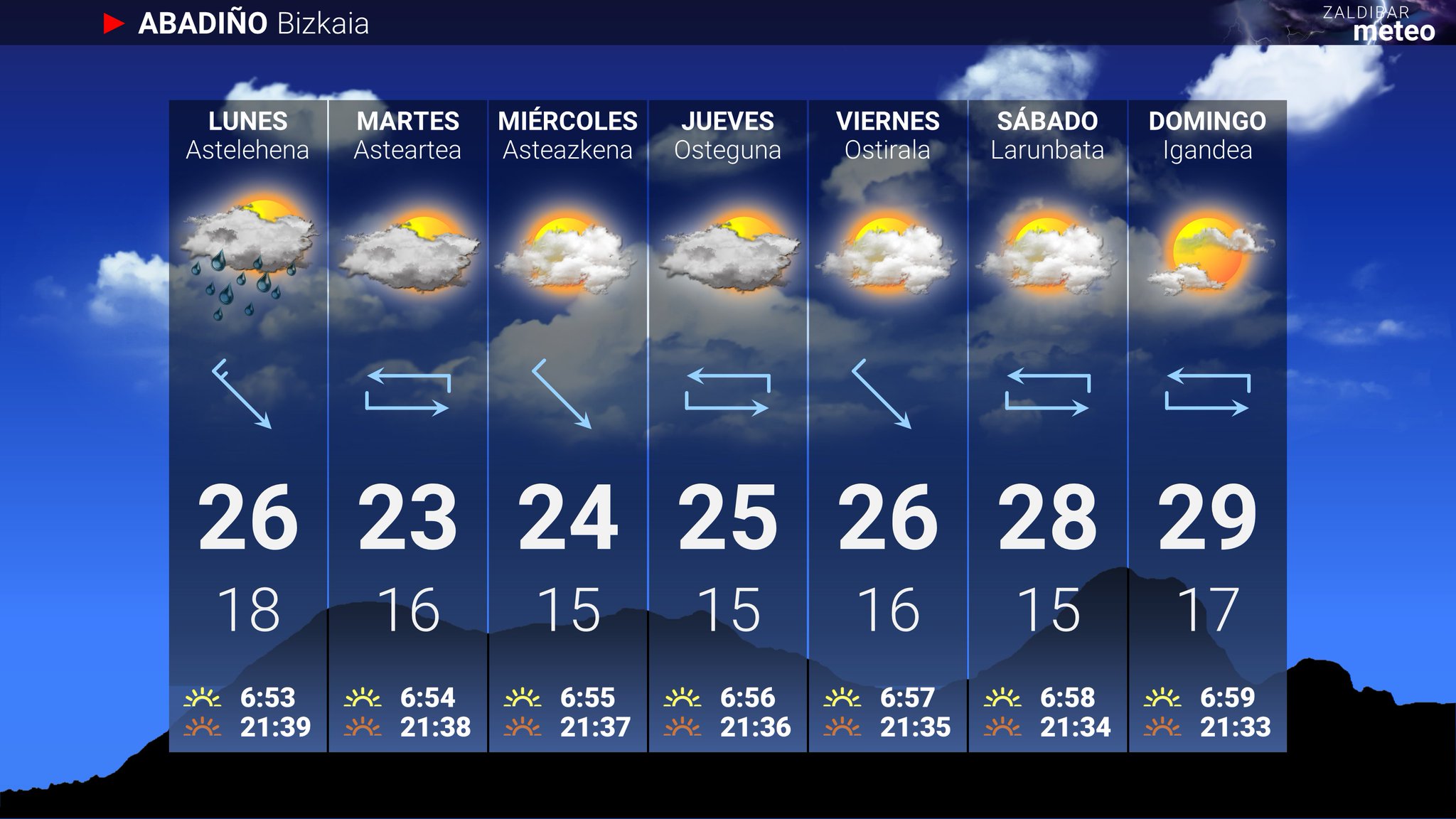 Descenso notable de las temperaturas máximas para el lunes, no superándose los 30 ºC en la mayor parte de las zonas, en torno a 27 en Durangaldea. Las temperaturas mínimas pueden subir 2 o 3 grados. Predominio de las nubes bajas, aunque por la tarde se abran algunos claros; podría llover durante la primera mitad del día y por la noche.