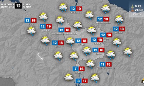 EGURALDIA | Durante gran parte del miércoles el tiempo será similar, con abundante nubosidad de tipo bajo y algunos chubascos, más frecuentes e intensos en la vertiente cantábrica y durante las horas centrales. Al final de la tarde remitirá la lluvia y disminuirá la nubosidad. Por la noche no lloverá y el cielo quedará poco nuboso, con algunos restos de nubosidad en el interior. Viento del norte, más intenso por la tarde, y temperaturas sin demasiados cambios.