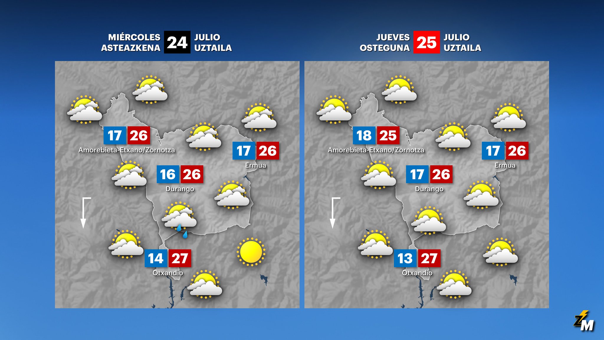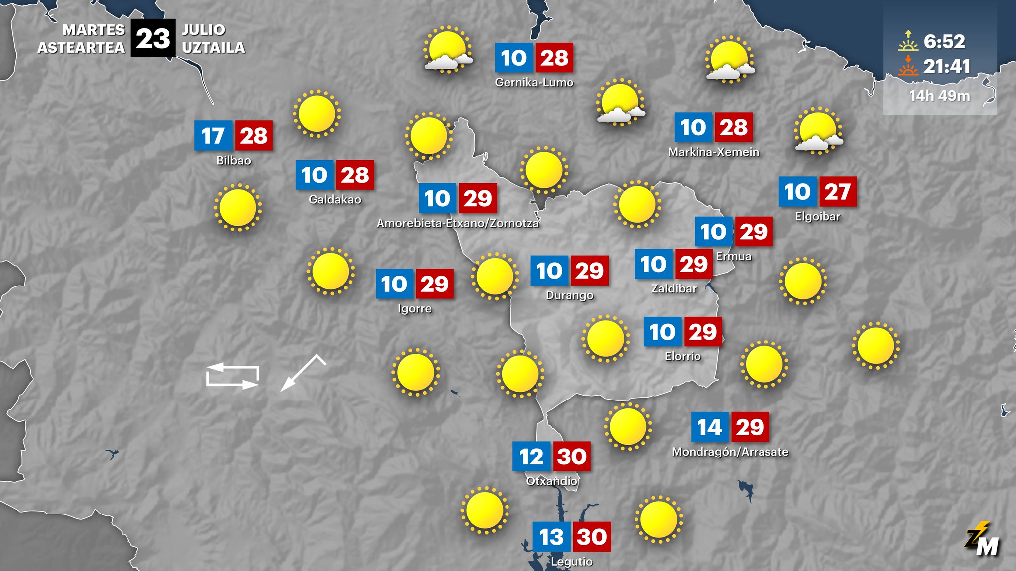 EGURALDIA | El martes se mantiene el tiempo veraniego. Las temperaturas máximas volverán a subir y rondarán los 28-30 ºC en el interior, en el sur se superarán estos valores y hará calor. En la costa, en cambio, a partir del mediodía entrará la brisa y frenará la subida de las temperaturas, las más altas rondarán los 25 ºC. Jornada soleada, con algunas nubes bajas al final del día en la vertiente cantábrica. Por la tarde-noche el viento ira ganando fuerza, sobre todo en el sur.