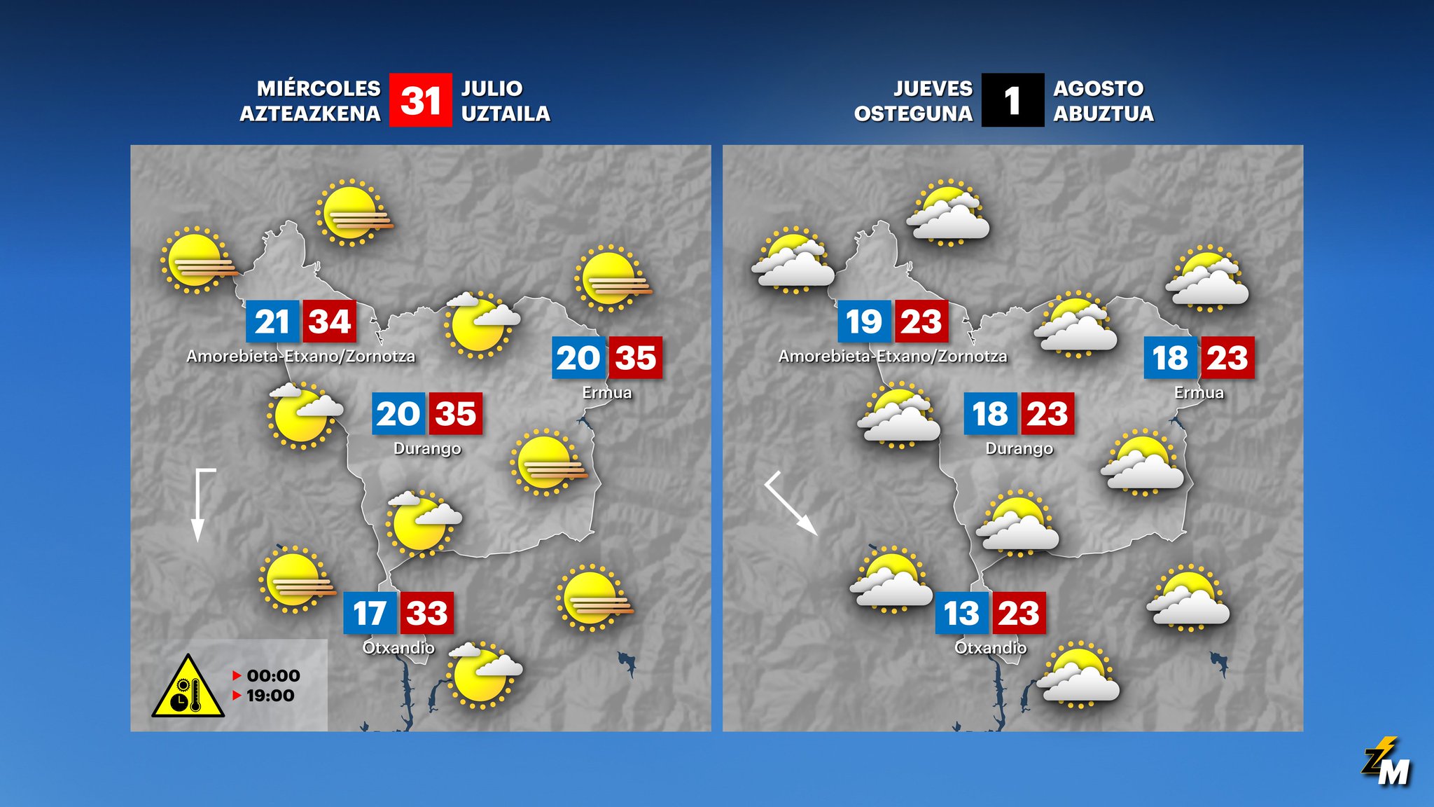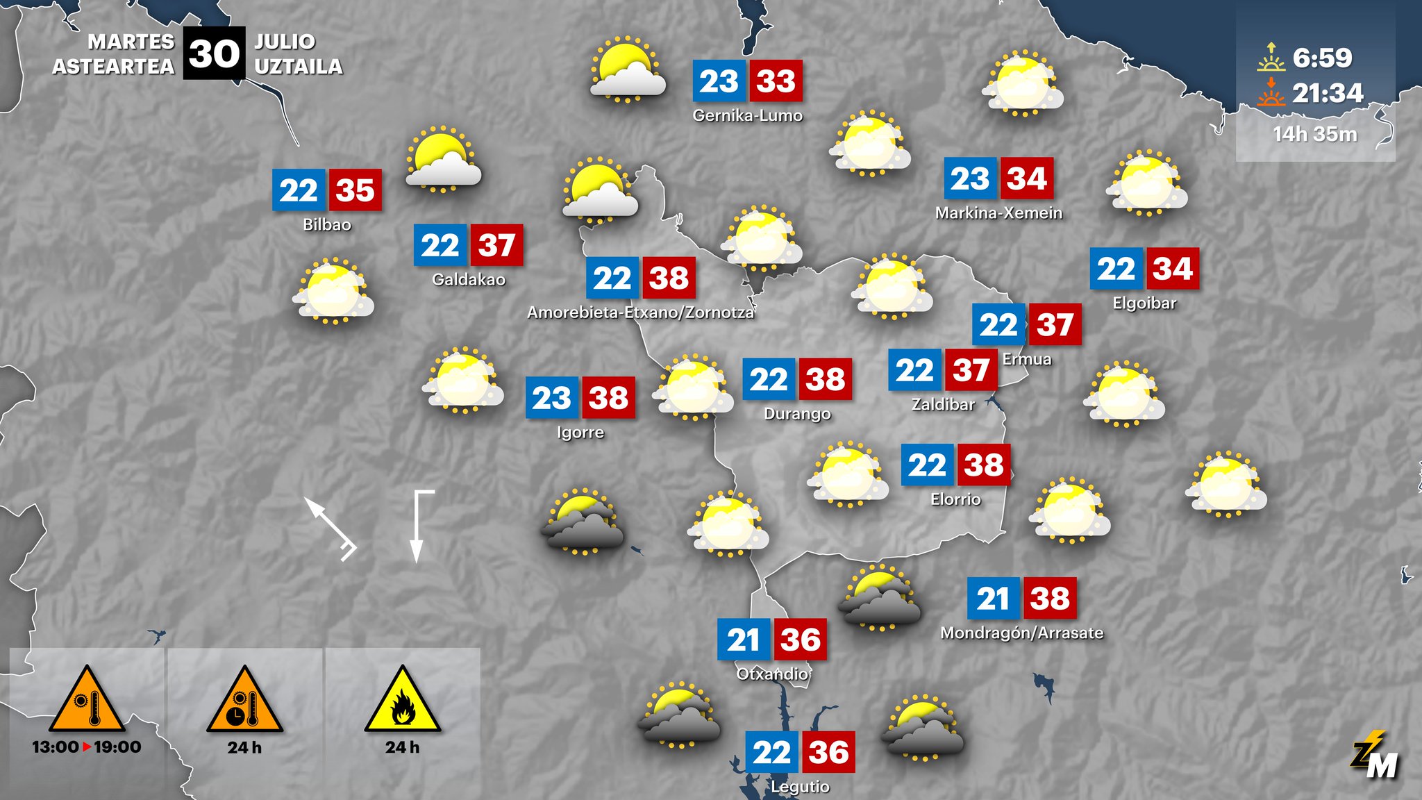 EGURALDIA | El martes el calor seguirá apretando. Se repetirán las temperaturas máximas de ayer lunes, de manera que en el interior se superarán ampliamente los 35 ºC. Además, de madrugada soplará el viento del sur y las mínimas también serán altas. El ambiente será claro, con nubes medias y altas. No se descarta que se puedan dar algunos chubascos tormentosos. El viento será del este y del sureste y girará a componente norte, durante la mañana en el litoral y durante la tarde en el interior.