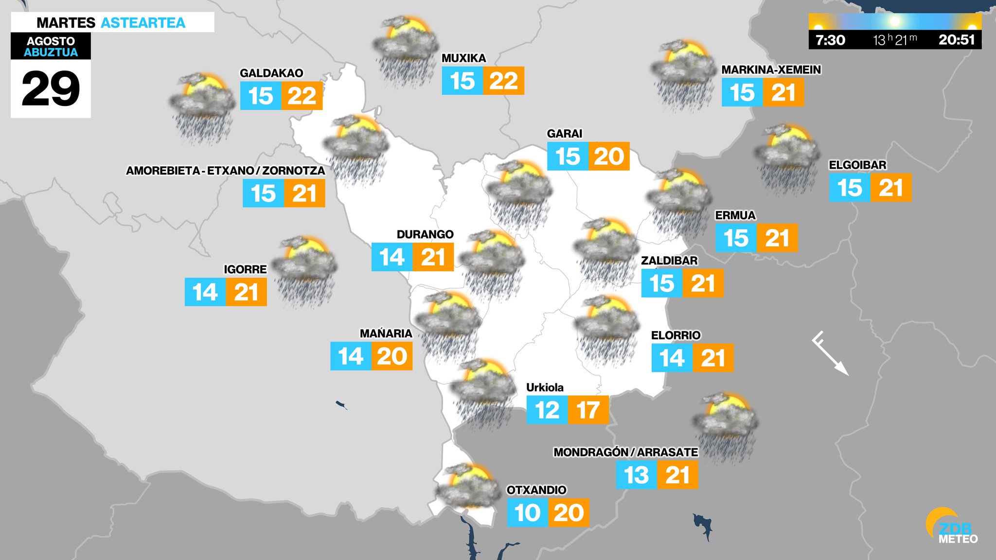 EGURALDIA | El martes seguirá lloviendo, aunque lo hará de manera más intermitente y las precipitaciones no serán tan abundantes. Viento del oeste o noroeste, algo menos intenso que en días pasados, aunque aún dejará rachas fuertes por la tarde. Temperaturas sin muchos cambios.