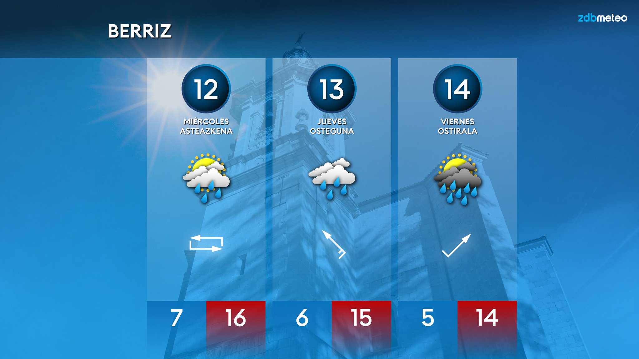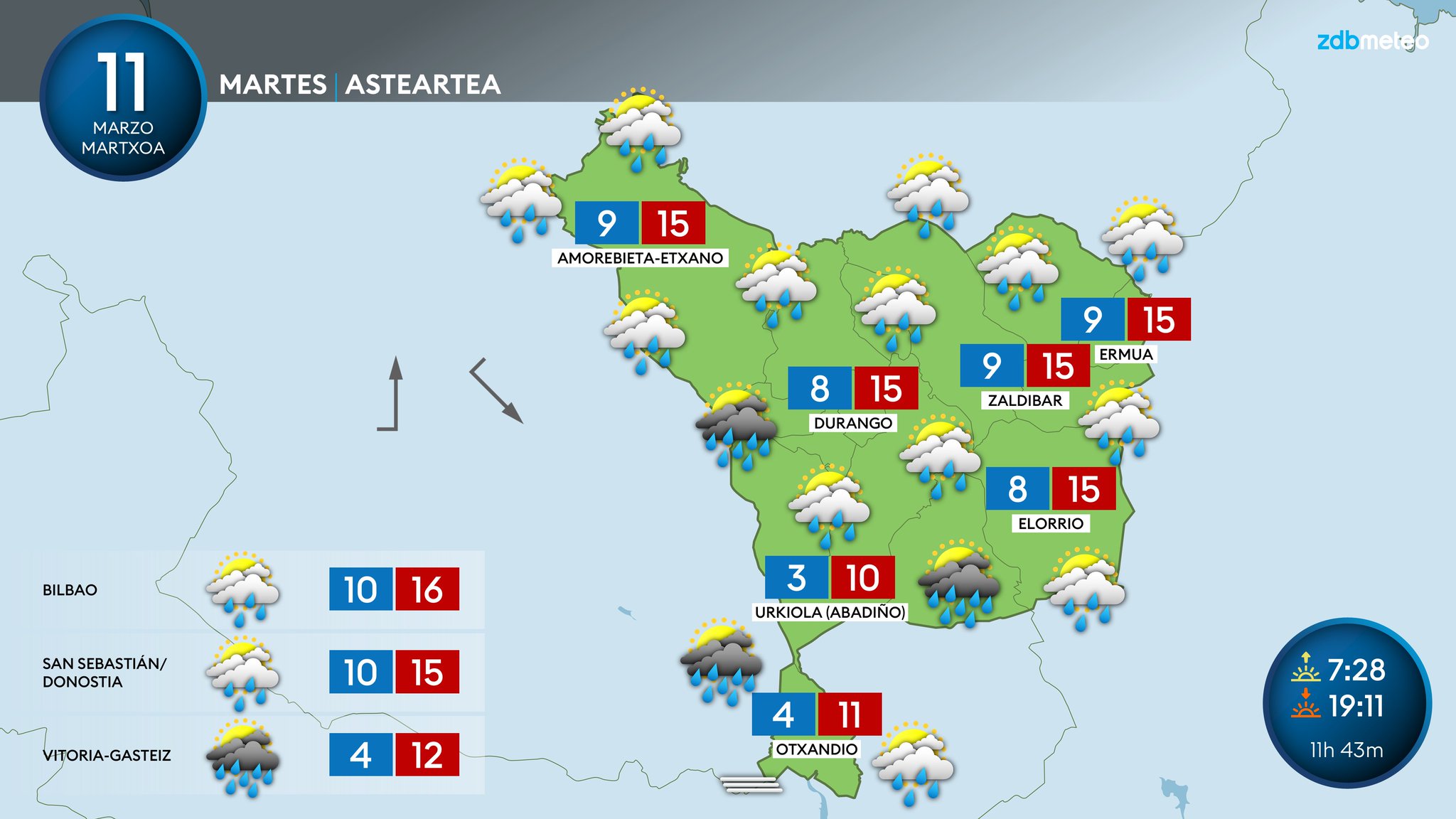EGURALDIA | El martes el cielo estará nublado y se producirán algunos chubascos, especialmente a primeras horas del día y a partir de la tarde. El viento será inicialmente del sur, pero durante las horas centrales pasará a soplar del oeste o noroeste y perderá fuerza. Debido al giro del viento, las temperaturas diurnas serán un par de grados más bajas.