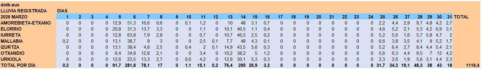 • El día más lluvioso: El 6 de marzo fue una jornada crítica, con 281,8 l/m² registrados en un solo día en la comarca. Iurreta lideró ese día con 63,8 l/m².