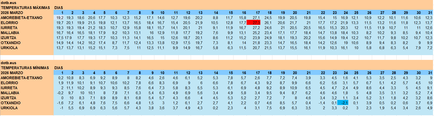 • Mínima del mes: El invierno se hizo sentir el 24 de marzo, con -2,1°C en Otxandio. Urkiola también registró valores negativos (-1°C) al inicio del mes.