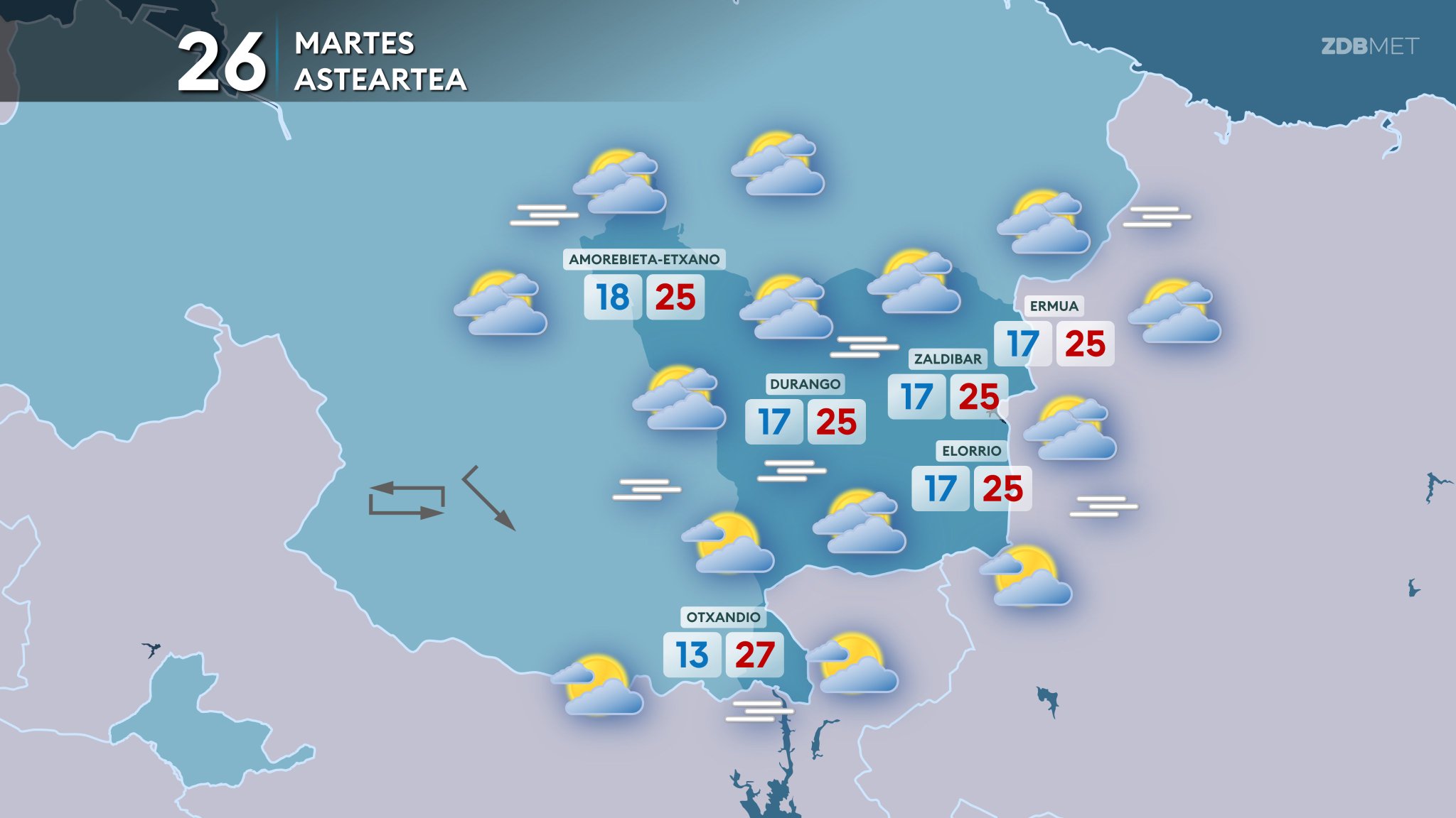 EGURALDIA | El martes aumentará la nubosidad. Comenzaremos el día con nubes bajas en la zona cantábrica, donde se puede escapar alguna llovizna, y ambiente más claro en el sur. Durante la tarde la nubosidad irá a más y se pueden producir lluvias y algunos chubascos, sobre todo al final de la tarde y por la noche. Los vientos predominantes serán de componente norte, a excepción del Valle del Ebro, donde soplará el sureste la mayor parte del día. Debido al viento del norte y la nubosidad las temperaturas máximas bajarán, especialmente en el interior.