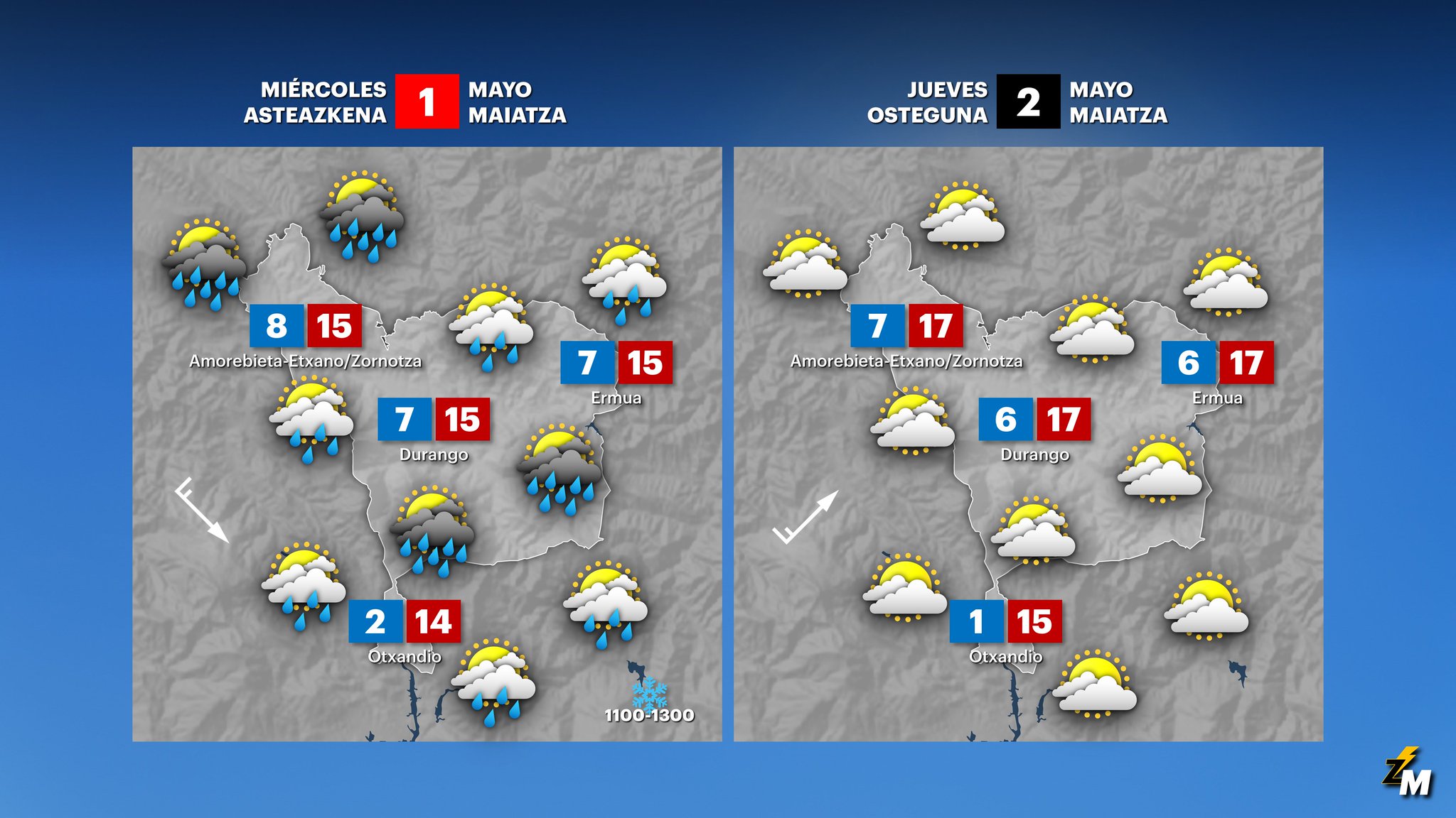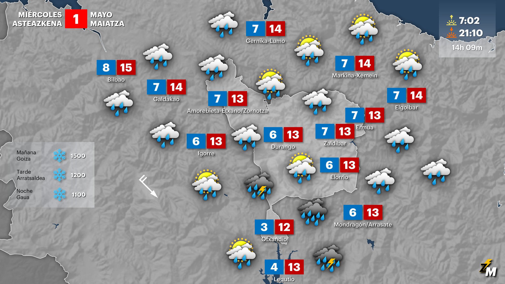 EGURALDIA | Se estrena el mes de mayo con lluvias generalizadas y generosas. El miércoles estará bastante cubierto, sobre todo en las primeras horas. Al comienzo lloverá de forma persistente y a partir de la tarde lo hará con carácter intermitente. No son descartables las tormentas. Volverán a caer de forma significativa las temperaturas y la cota de nieve podría bajar hasta los 1.000 metros. Al final del día se abrirán grandes claros por el oeste y remitirán las precipitaciones.
