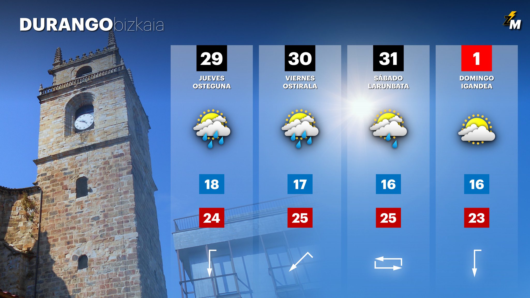 EGURALDIA | El miércoles comenzará a manifestarse una incipiente inestabilidad, que se traducirá en chubascos dispersos de carácter tormentoso a últimas horas del día, durante la noche. Pero durante la mayor parte de la jornada predominarán los cielos poco nubosos, a excepción de las comarcas cantábricas, donde aparecerán intervalos de nubes bajas. En la mitad sur seguirá el ambiente caluroso, con máximas todavía por encima de los 30 °C; en el norte la conjunción de nubes y vientos suaves de componente norte favorecerán un descenso notable de las máximas.