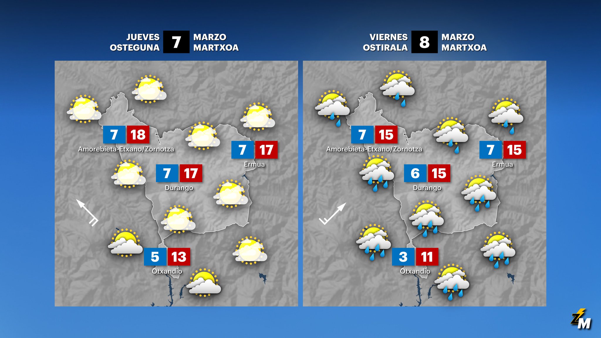 EGURALDIA | El miércoles se volverán a imponer los vientos de componente sur, regresando el tiempo seco. Regresarán las nieblas a primeras horas, combinándose con heladas en algunos puntos. Pocas nubes en el cielo para comenzar la jornada, durante la tarde irán en aumento las nubes medias y altas. Las temperaturas diurnas recuperarán los valores que perdieron la jornada anterior.