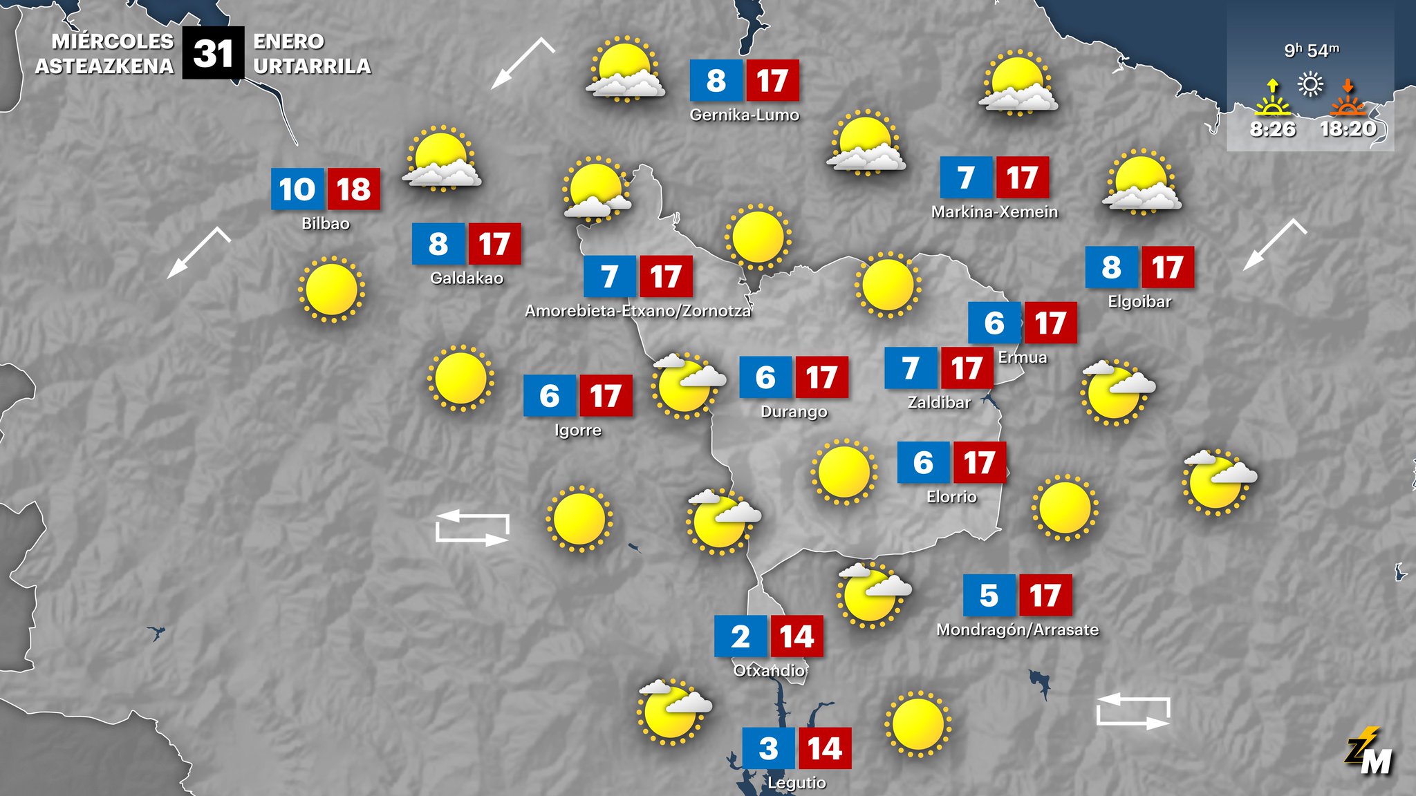 EGURALDIA | El miércoles apunta a otra jornada más de tiempo seco y soleado. Cielos despejados desde primeras horas. Al final del día aumentarán las nubes medias y altas. El viento del sur irá aflojando y quedará de dirección variable durante la tarde en el interior y predominará el nordeste en el litoral. Las temperaturas de madrugada serán ligeramente más bajas, las diurnas apenas sufrirán cambios.