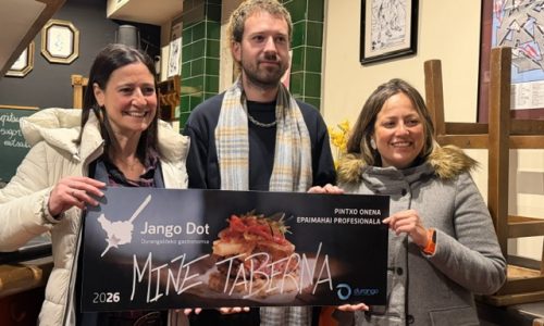 Maore, responsable del establecimiento Miñe, ubicado en Goienkale, ha recibido de manos de Mireia Elkoroiribe, alcaldesa de Durango, y Jesica Ruiz, teniente de alcalde, el reconocimiento profesional (premio de 900 euros). “Hay que agradecer la participación de todos los hosteleros en estas acciones, que sin duda son muy positivas para Durango. Durante todo el fin de semana se ha visto con muy buen ambiente, mucha gente con las cartillas de los pintxos y sin duda ha vuelto a ser una nueva edición de Jango DOT muy positiva para la vida social y económica del municipio”, han destacado Elkoroiribe y Ruiz en la entrega de los premios.