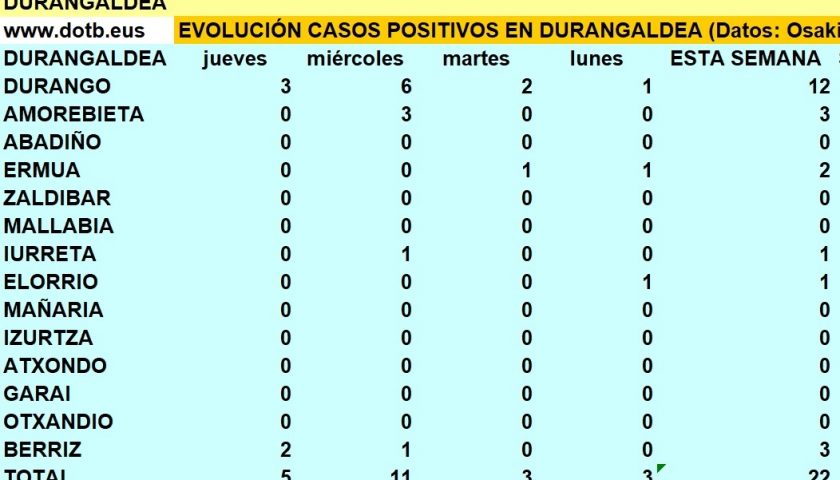 Además Abadiño registran dos contagios nuevos y Elorrio, Ermua, Mallabia y Amorebieta un caso más DURANGALDEA.- En las últimas 24 horas se han detectado 20 nuevos contagios, frente a los 22 del miércoles. Por localidades siete casos en Durango y Berriz, dos casos en Abadiño y uno en Ermua, Elorrio, Mallabia y Amorebieta. En cuanto …