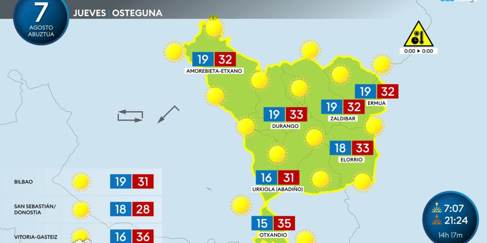 Euskalmet activará hoy el aviso naranja por altas temperaturas, mañana sábado hará menos calor EGURALDIA | El viernes repuntará el calor, deparándonos una nueva jornada de ambiente sofocante. Se impondrá el viento del sureste, que soplará racheado, y elevará las temperaturas ya desde la mañana. Las máximas alcanzarán o superarán los 37-40 °C en muchos …