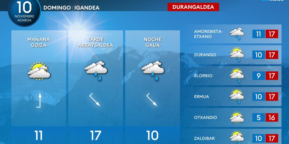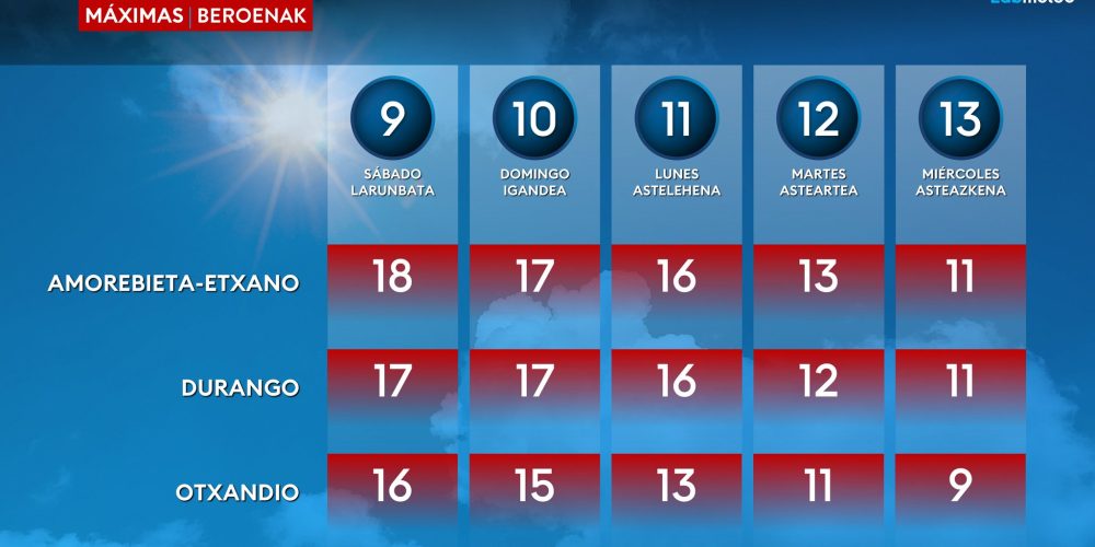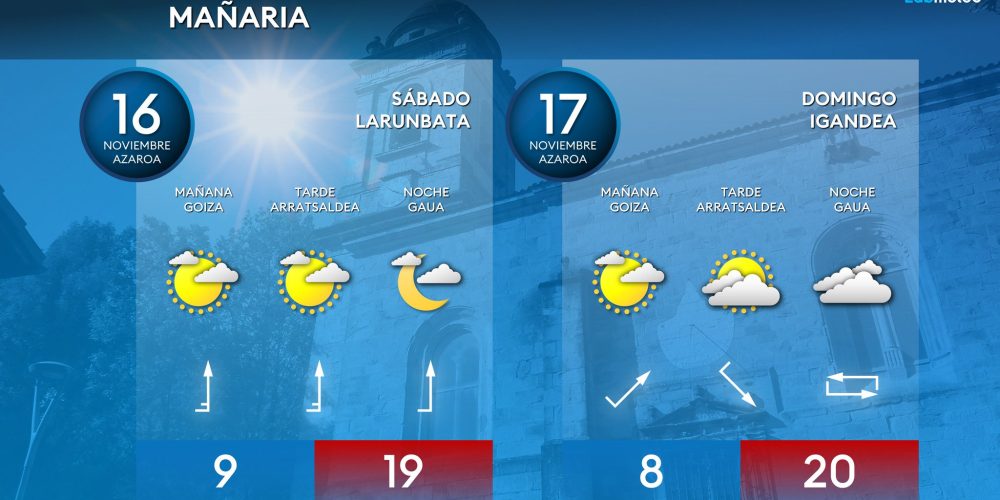 Las máximas subirán y situarán en torno a los 20 grados EGURALDIA | Vuelven las jornadas de «veroño» con viento sur para el fin de semana, con sol, temperaturas suaves el día y más frías durante la noche. Para la semana que viene podrían volver las lluvias y el tiempo más «invernal» con nieve en …