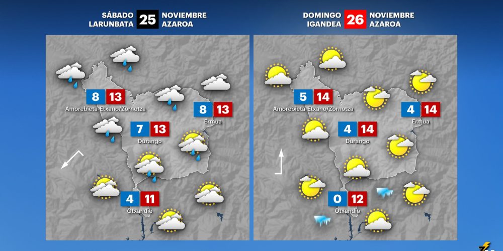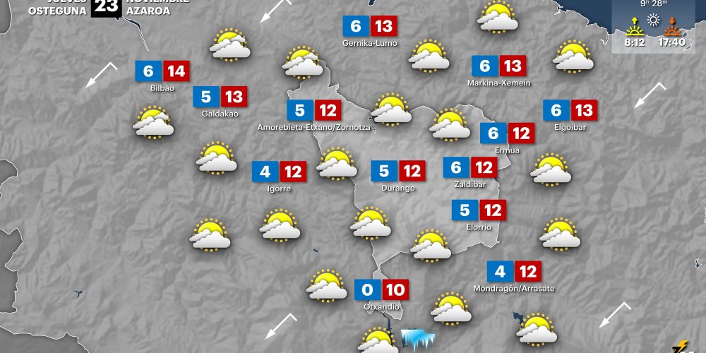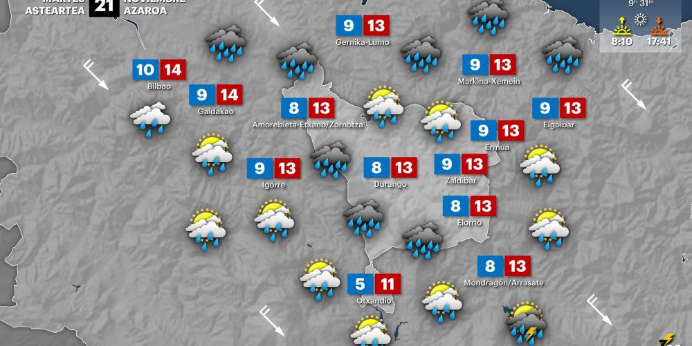 Las mínimas del día se registrarán al final de día EGURALDIA | El jueves será un día gris y lluvioso en todas partes. Las precipitaciones arreciarán a primeras horas del día y serán frecuentes y abundantes durante las horas diurnas; por la noche tenderán a remitir. El viento soplará inicialmente del oeste, después perderá fuerza …