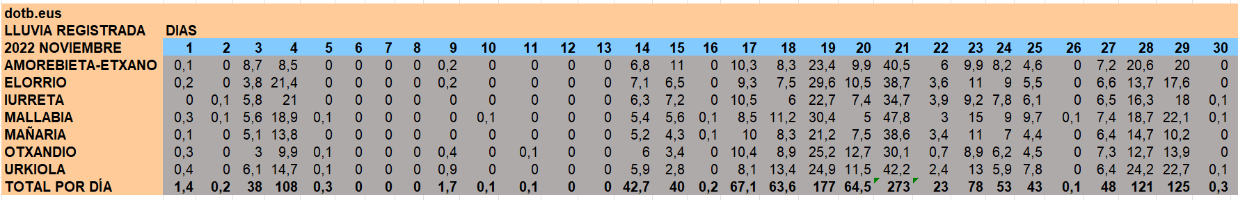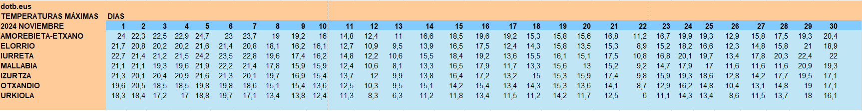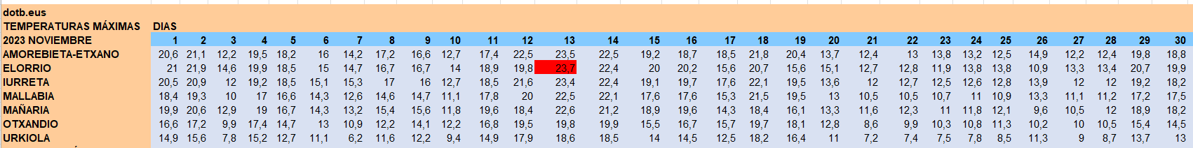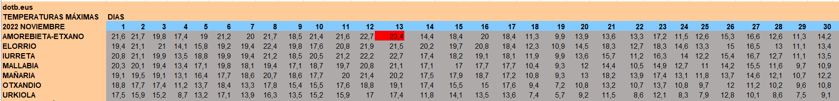 DURANGALDEA | Noviembre deja temperaturas más altas de lo habitual, teniendo en cuenta los registros de años anteriores. El pasado mes se registró la máxima de 24,7 grados en Amorebieta el 7 de noviembre, en 2023 fueron 23,7 grados el 13 de noviembre de 2023 la máxima en Iurreta, y en 2022 se registraron 23,2 grados envAmorebieta también el 13 de noviembre.