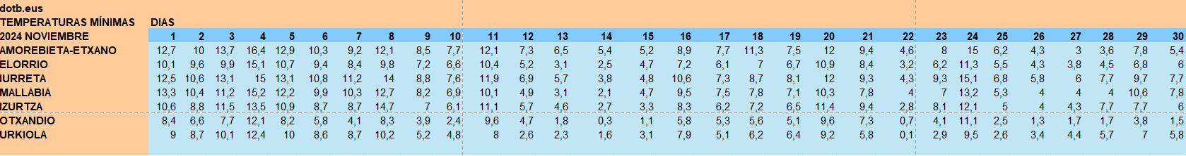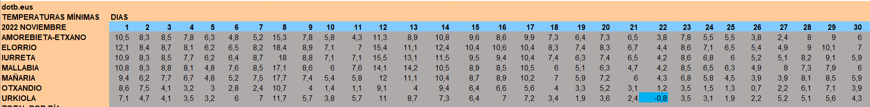 En cuanto a las temperaturas mínimas, este también han sido más elevadas que años anteriores, sin llegar a helar ningún día. El 22 de noviembre se registron 0,1 grados en Urkiola, frente a los 0.4 de 26 de noviembre de 2023 y a los -0,8 grados de 22 de noviembre en 2022.