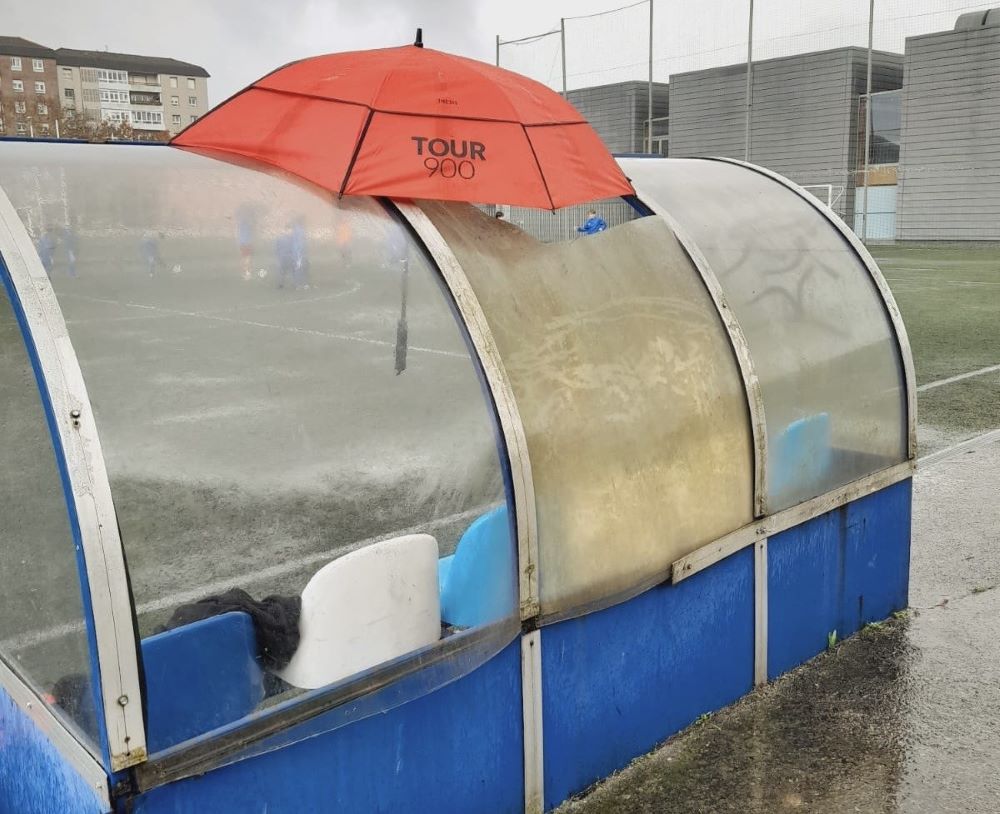 ZUREDOT | Aitas y amas de Zabalarra Eskola nos hacen llegar esta fotografía para ilustrar lo que tuvieron que hacer el pasado fin de semana para que sus hijas e hijos no se mojasen durante los partidos disputados en el campo de fútbol 7 de Arripauseta. Y es que uno de los banquillos de la instalación se encuentra en muy mal estado, por lo que la solución pasó por hacer uso de un paraguas para que los jóvenes no se mojasen. «Confiamos en que lo reparen lo antes posible porque es triste que tengamos así las instalaciones deportivas», han lamentado los progenitores.