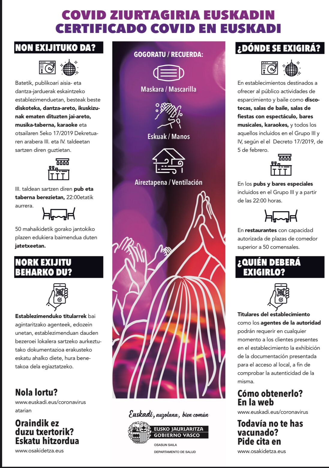 EUSKADI.- El Gobierno vasco activará desde este sábado, 4 de diciembre, la exigencia del pasaporte covid en determinados establecimientos de ocio nocturno y en los restaurantes con capacidad para más de 50 comensales. Aunque el LABI estudia ampliar a otros espacios como eventos en sitios cerrados, gimnasios, visitas a centros de mayores y hospitales y otros ámbitos de la restauración, «aunque para ello solicitaríamos el aval del TSJPV», ha señalado esta tarde el lehendakari Iñigo Urkullu.
