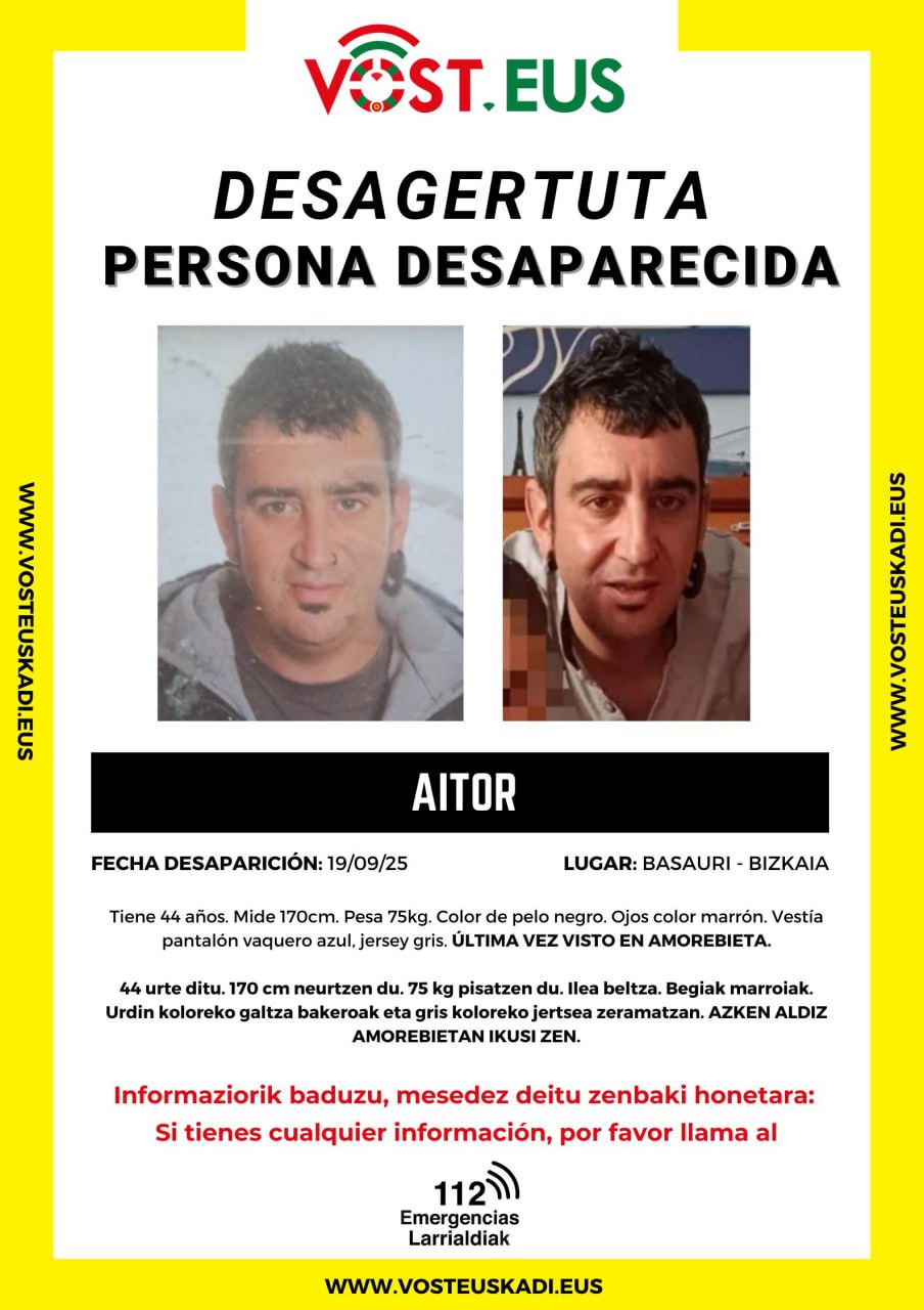 AMOREBIETA-ETXANO | VOST Euskadi ha lanzado la alerta para buscar a Aitor Varela Santamaría, un hombre de 44 años, de 1,72 metros de altura y unos 75 kilos de peso, desaparecido desde el pasado 19 de septiembre en Amorebieta. La Ertzaintza ha confirmado a DOT que consta una denuncia por desaparición.