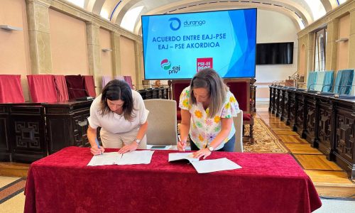 DURANGO | El PNV y PSE han firmado este martes el acuerdo para gobernar en coalición el Ayuntamiento de Durango en la próxima legislatura. En una rueda de prensa conjunta que ha contado con la presencia de las líderes de ambas formaciones, la jeltzale Mireia Elkoroiribe y la socialista Jesica Ruiz, han explicado el acuerdo programático que se prolongará durante 2023-2027 y que llevará a Ruiz a ocupar la vicealcaldía. Será un gobierno en minoría que “intentará lograr acuerdos amplios con todas las formaciones”, ha asegurado la alcaldesa Mireia Elkoroiribe.