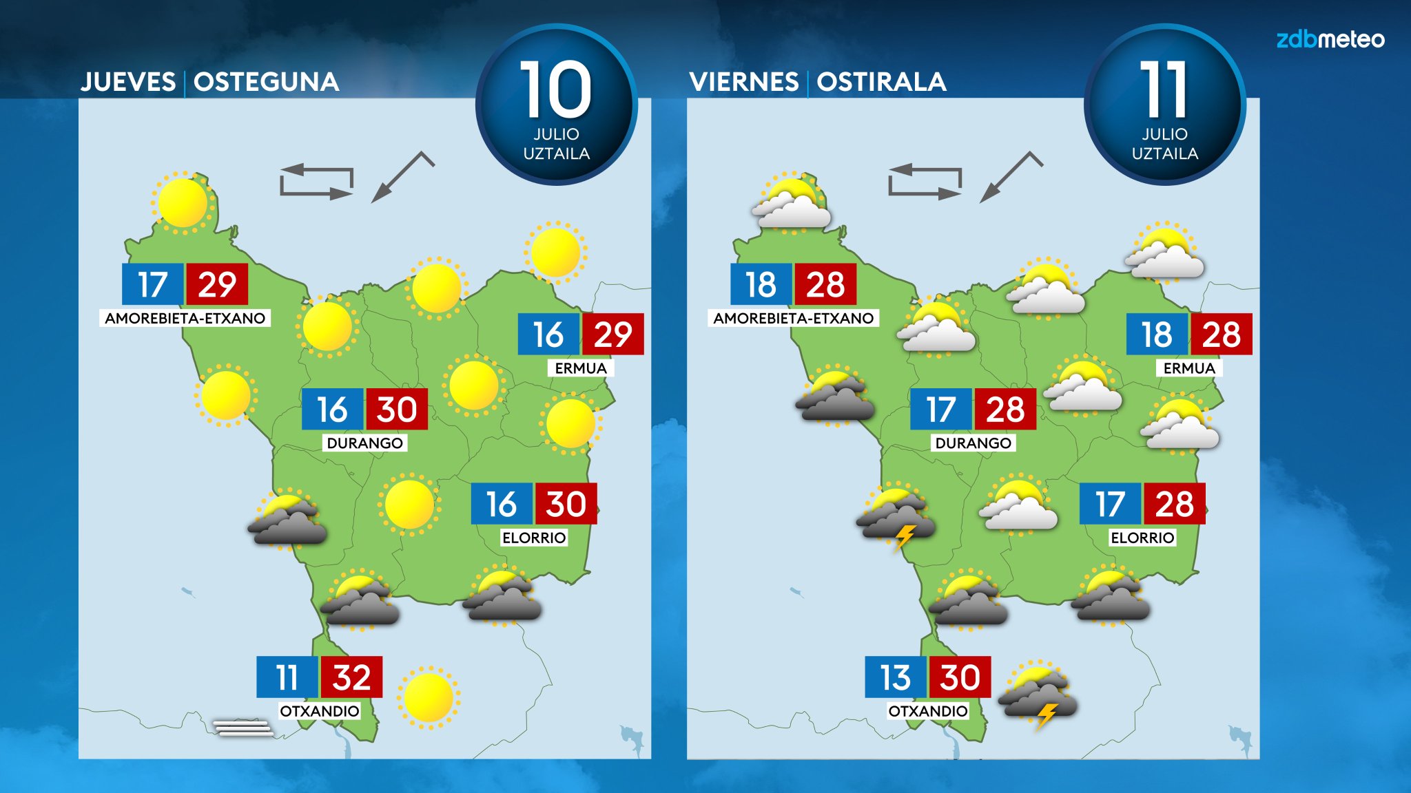EGURALDIA | El miércoles regresarán el tiempo soleado y el calor. Predominarán los cielos despejados desde los inicios, salvo algunas nieblas a primeras horas. El viento soplará suave del nordeste. Las temperaturas de madrugada serán algo más frescas, mientras que las máximas serán más altas y ya se notará el calor en las comarcas del sur: por allí podrán superarse los 30 °C, mientras que cerca de la costa rondarán los 25 grados.