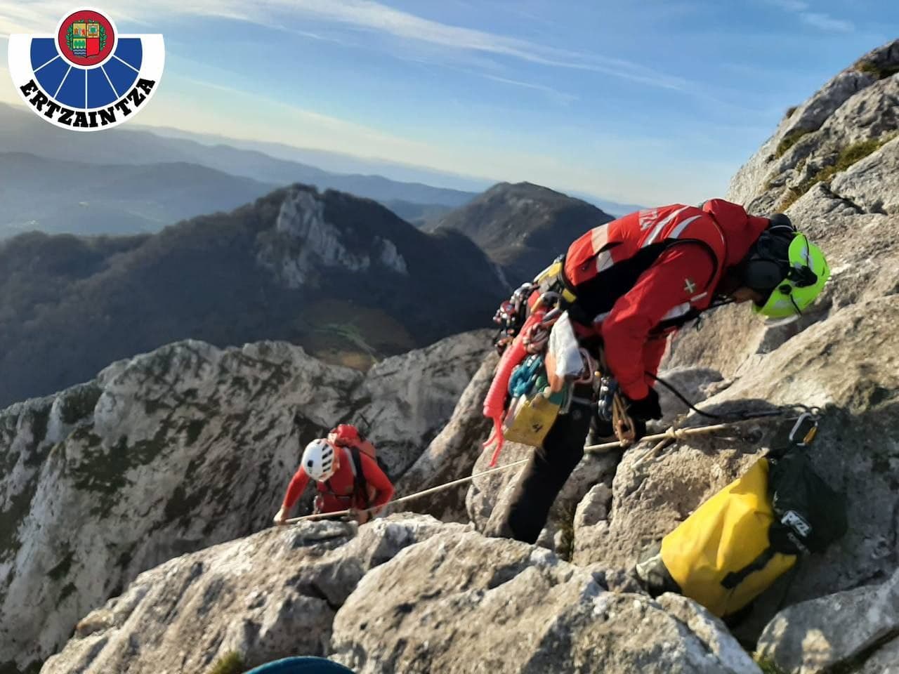 Cara Este del Anboto. Rescate de escalador en solitario, que ha quedado bloqueado en la R5 de la vía Zurdaia. Accedemos hasta él y rapelamos hasta el suelo. Sano y salvo.#uvr pic.twitter.com/ro8TyJiivF