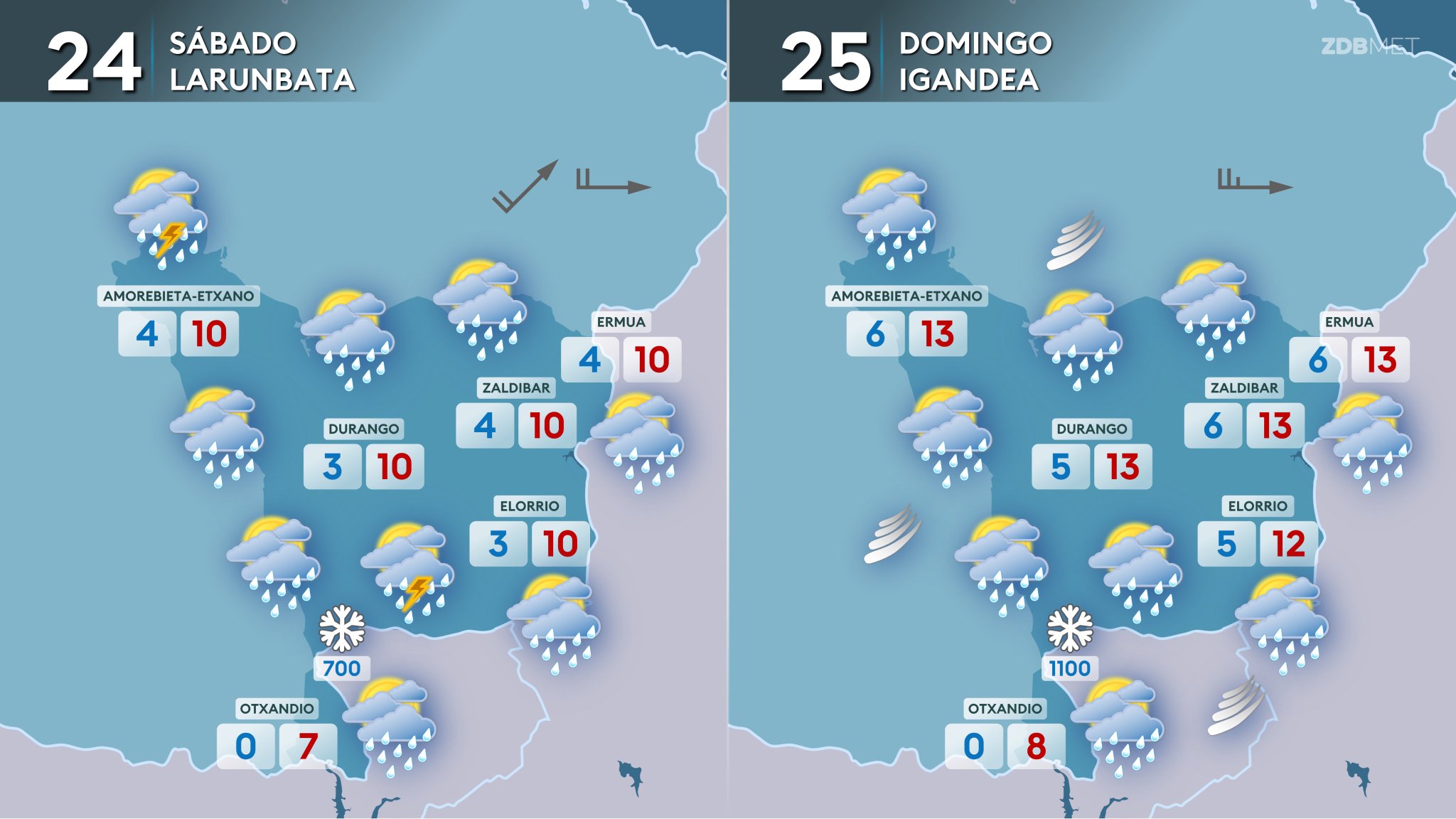 EGURALDIA | El sábado aumentará la inestabilidad y se notará un ambiente más frío. La mañana, en general, será tranquila, con nubes y claros y las precipitaciones serán poco probables. Sin embargo, a partir del mediodía nos alcanzará un frente y a partir de entonces se producirán chubascos, que podrían venir acompañados de tormentas. Lo más probable es que tras el paso del frente, por la noche, vaya remitiendo. Las temperaturas descenderán y la cota de nieve podría situarse en torno a 600-800 m, subiendo a 900-1000 m por la noche. Además, no se descartan heladas en zonas del interior. El viento soplará del suroeste por la mañana y girará a oeste en torno al mediodía y será intenso por la tarde, sobre todo en la costa.