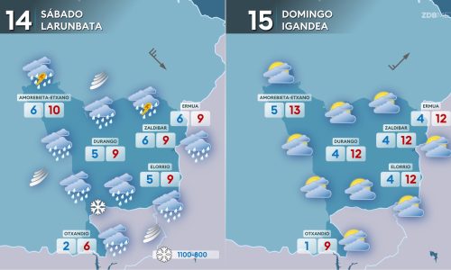 EGURALDIA | El sábado tendremos una jornada invernal. Se sucederán los chubascos durante toda la jornada, pero serán más abundantes durante la primera mitad del día, cuando se pueden dar también algunas tormentas con granizo en la mitad norte. Por la tarde y noche las precipitaciones perderán fuerza y tenderán a remitir al final del día. La cota de nieve bajará a 800-1000 m, aunque en el este de Araba podría estar más baja. Viento fuerte de componente norte durante la mañana, con rachas muy fuertes en zonas expuestas, y perderá fuerza durante la segunda mitad del día. Temperaturas en moderado descenso, con algunas heladas en zonas de montaña.
