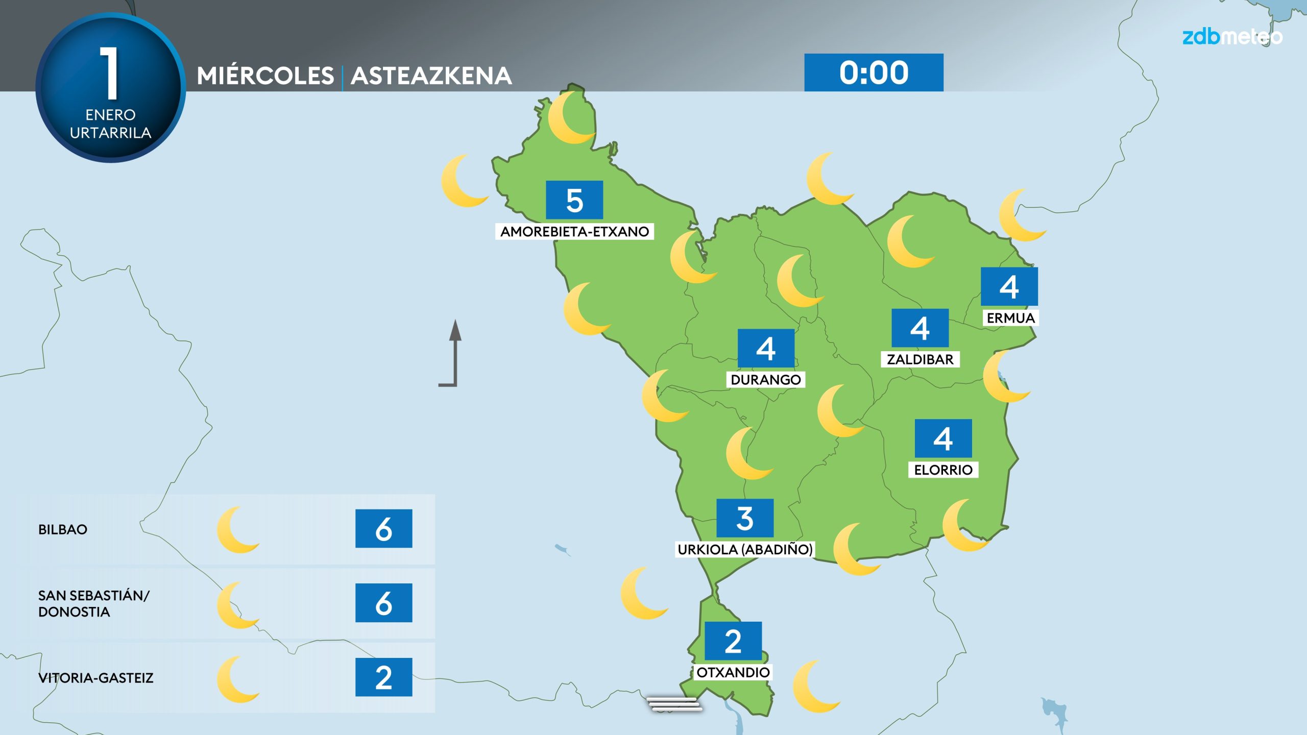 Comenzaremos el año sin apenas cambios. El miércoles volveremos a tener un día soleado y apacible. La única novedad será un incremento de la nubosidad media y alta al final del día. Frío a primeras horas, con algunas heladas en zonas del interior; las temperaturas máximas no excederán de los 15 °C en el mejor de los casos. El viento de componente sur podría ganar un poco de protagonismo al final del día en la costa.
