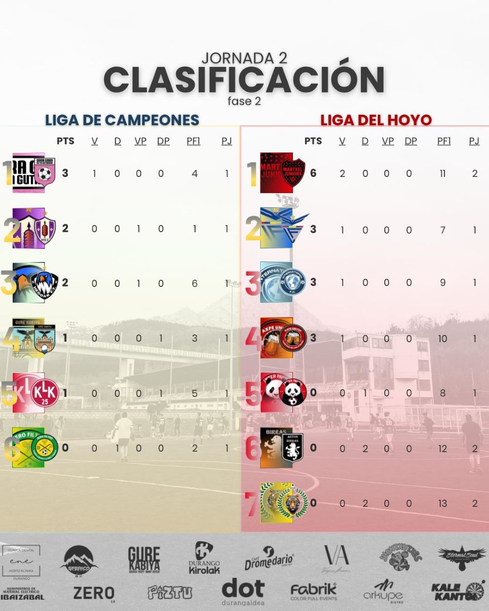 FUTBOL | La Kings Durango regresaba este domingo a Tabira y lo hacía con nueva jornada en la Liga del Hoyo. El propósito: conocer dos nuevos equipos para los ansiados Play Off. En esa disputa, Martxel Juniors lograba su segunda victoria en dos jornadas y se coloca líder en solitario. Por otro lado, primera victoria para el Axpe y Lojanos mientras que Aston Birras y Tigres todavía no conocen la victoria y se les complica la clasificación.
