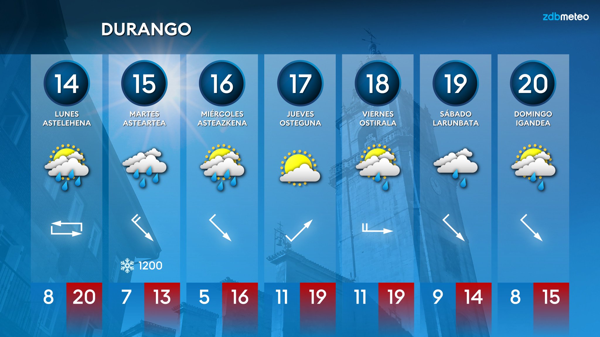 EGURALDIA | La Semana Santa vendrá marcada por un tiempo muy inestable en Durangaldea. Nubes, claros, lluvias, tormentas y ambiente más fresco a partir de mañana, martes, sobre 15 grados de máxima, serán las características del tiempo para esta semana. Los vientos hoy serán del sur y dejarán temperaturas agradables que darán paso al norte, dejando un ambiente fresco para toda la semana.