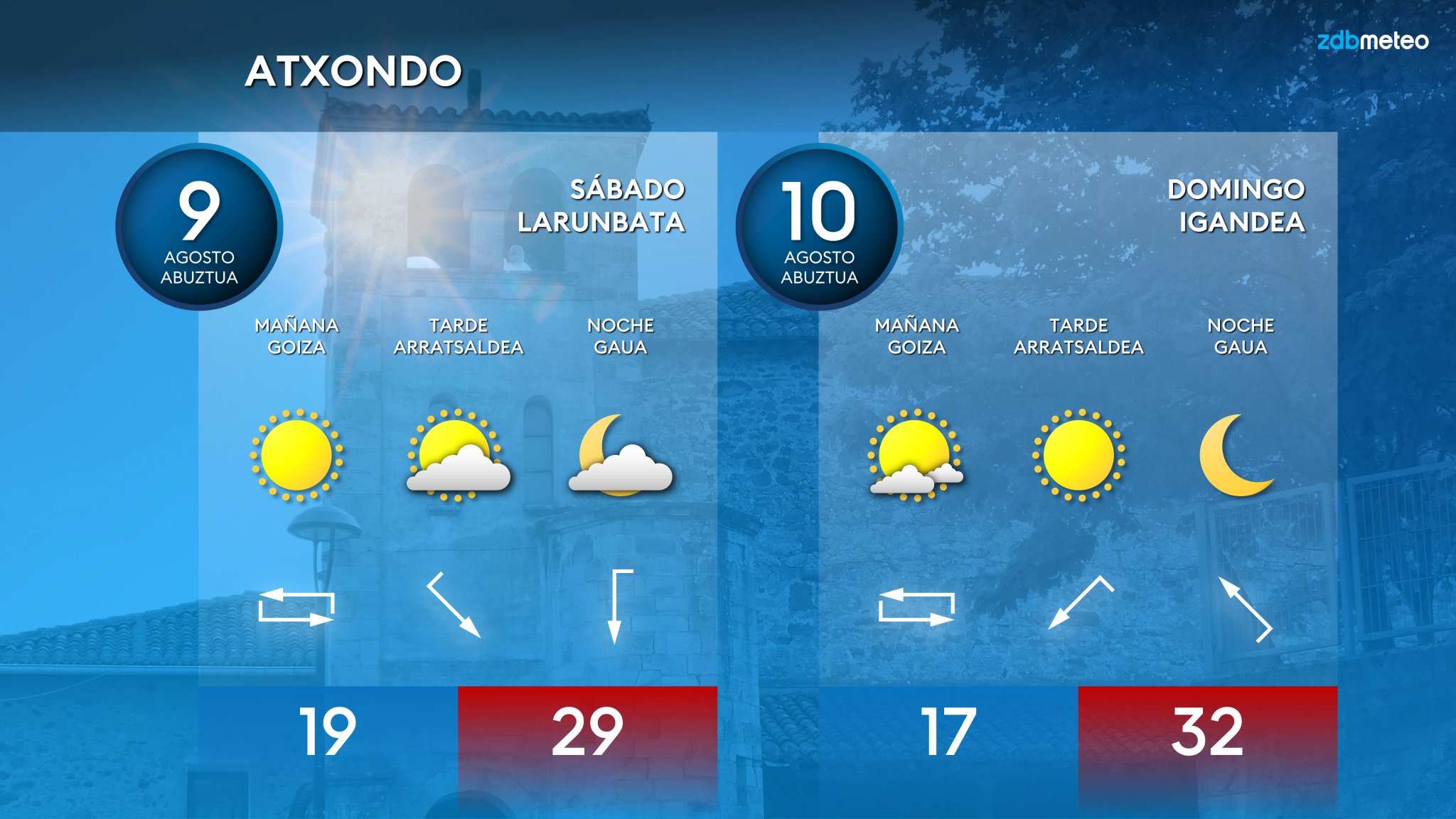 EGURALDIA | El segundo fin de semana de agosto vendrá marcado por el sol y las altas temperaturas, que rondarán los 30 grados este viernes y el sábado, mientras que el domingo podrán incluso superar los 35. Por ello, Euskalmet ha activado el aviso amarillo para los próximos días. Hoy será un día caluroso, el sábado algo menos por el viento de noroeste, pero el domingo volverán a subir. Ayer la máxima se registró en Amorebieta con 32,2 grados y en Iurreta y Otxandio con 30,3. Este viernes podrán subir algo más.