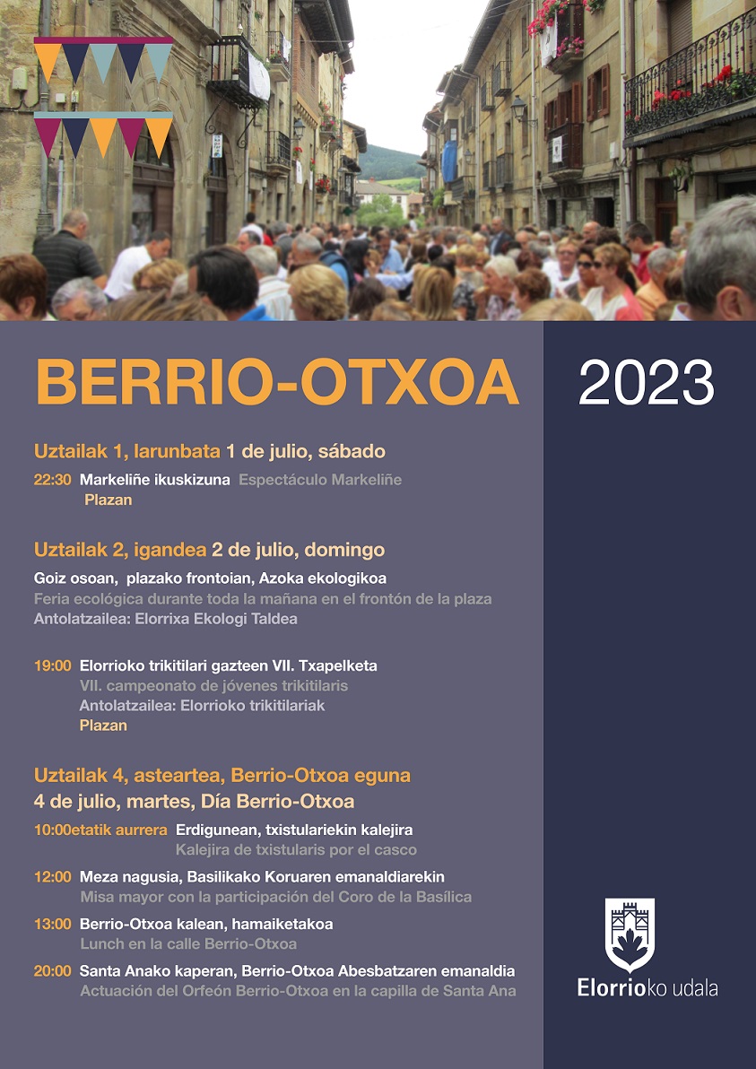 El martes, 4 de julio, se celebrará el día de San Valentín de Berri-Otxoa. A partir de las 10:00, un grupo de txistularis hará un pasacalle por el casco. A las 12:00 horas, tendrá lugar la misa mayor, acompañada por la actuación del coro de la Basílica.