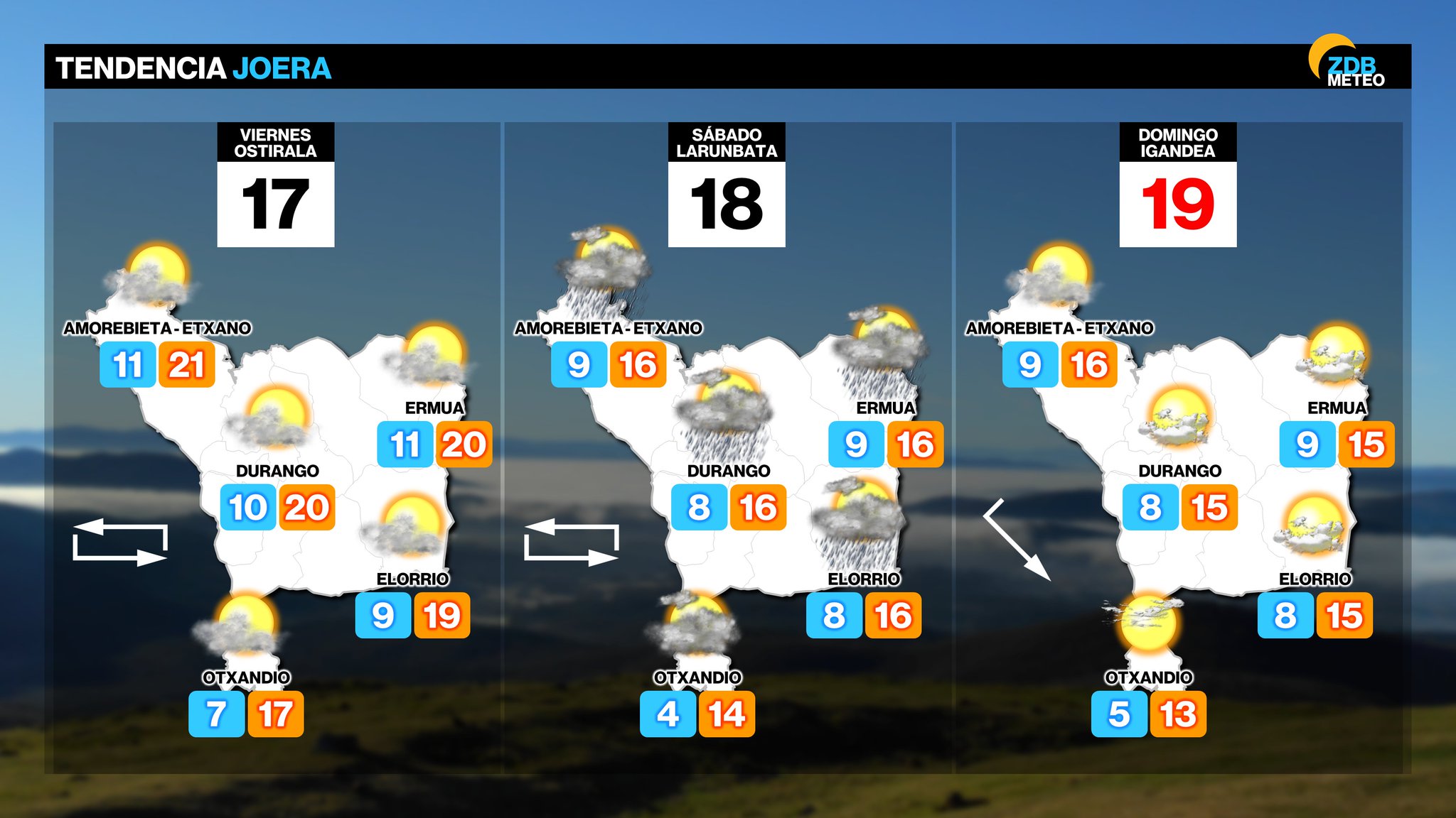 EGURALDIA | El viento sur soplará con fuerza el jueves. La intensidad del viento sur hará que suban notablemente las temperaturas diurnas, con máximas casi veraniegas. Jornada soleada, aunque las nubes altas pueden llegar a velar ocasionalmente el cielo; a partir de la tarde irán a más las nubes medias y altas desde el oeste.