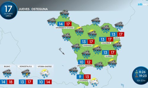 EGURALDIA | Tiempo fresco, gris y lluvioso para el jueves. El cielo estará cubierto y se producirán chubascos frecuentes e intensos, especialmente durante la primera mitad del día, cuando irán acompañados de tormentas. Por la tarde-noche la lluvia remitirá. Viento intenso del oeste-noroeste, con algunas rachas muy fuertes, sobre todo en la costa y en el Valle del Ebro. Temperaturas diurnas en acusado descenso.