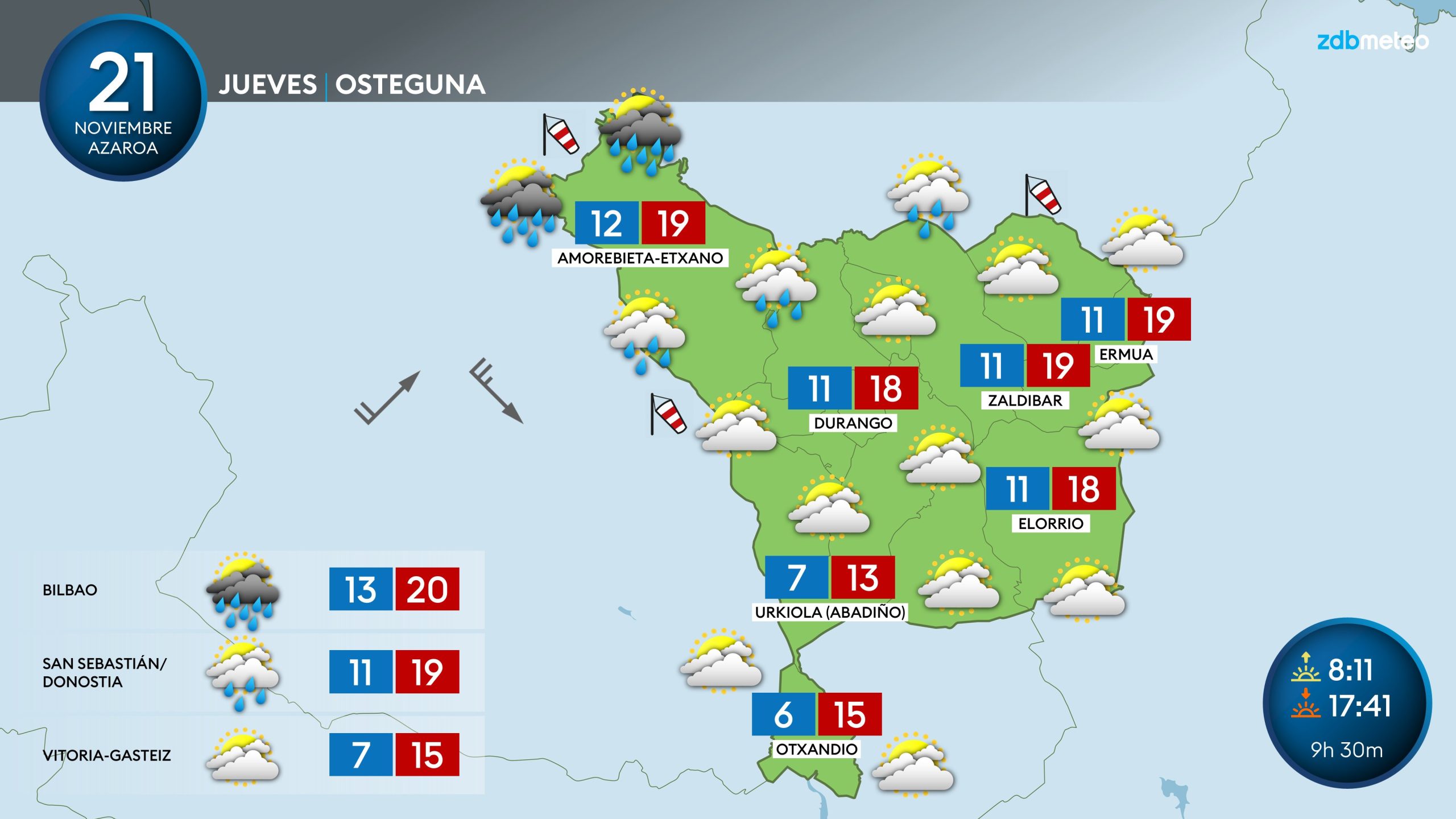 EGURALDIA | El jueves seguirá el tiempo desapacible. De madrugada las lluvias remitirán, durante la mañana el viento se fijará del suroeste y soplará con cierta intensidad. Las temperaturas diurnas subirán ligeramente. Durante la tarde, el viento girará a noroeste y seguirá soplando con fuerza, además, traerá consigo precipitaciones que entrarán desde el mar y que se irán generalizando hasta afectar a buena parte del territorio por la noche.