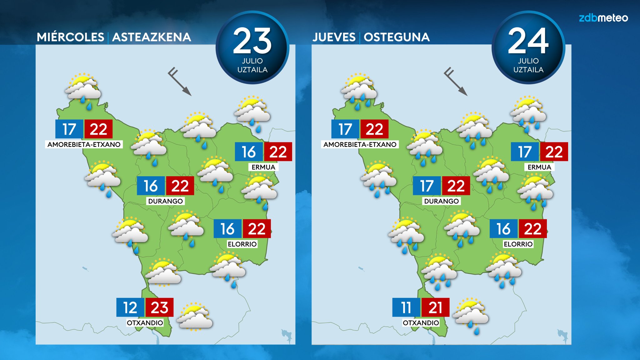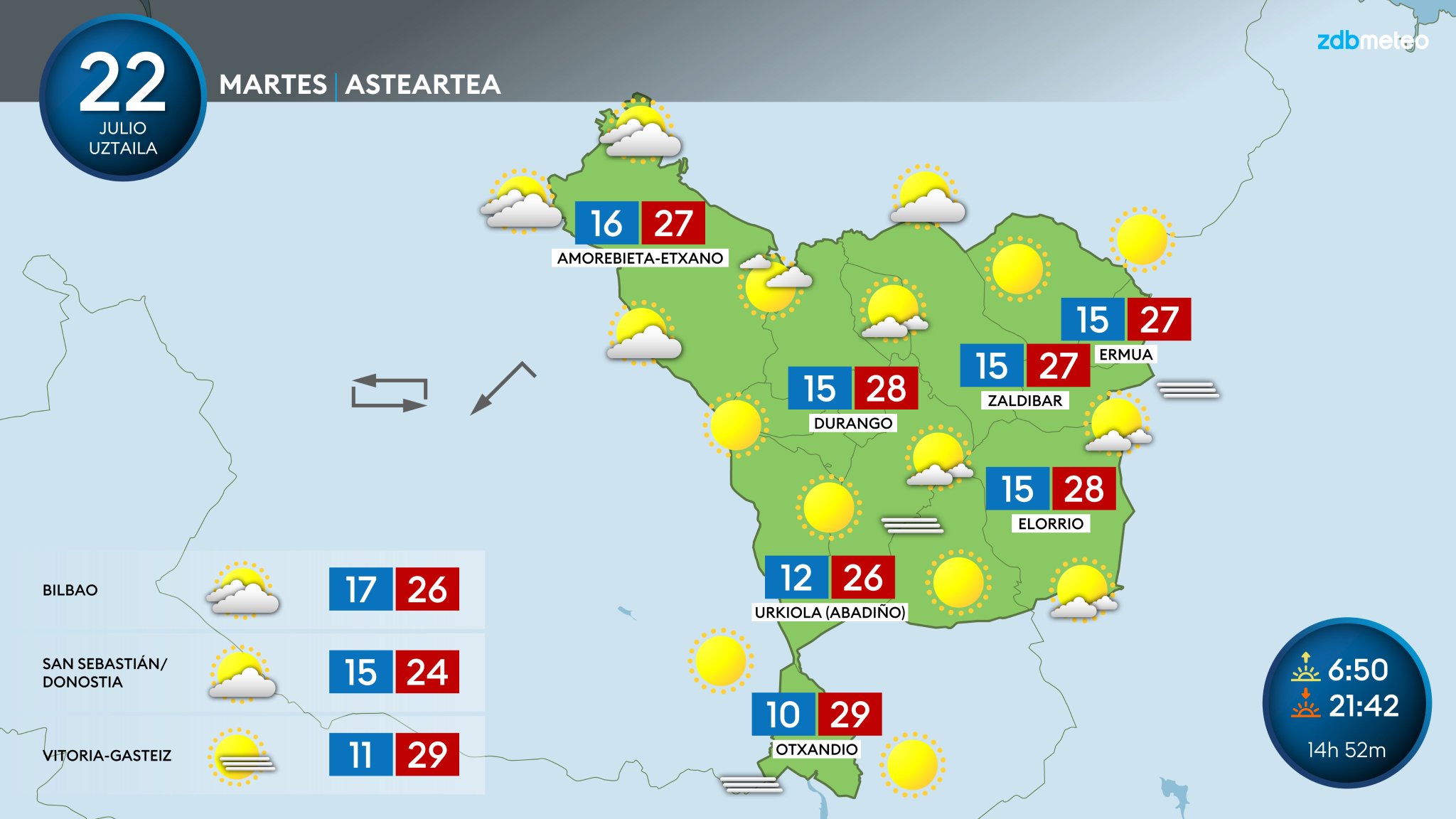 EGURALDIA | Tiempo soleado y veraniego para el martes. Subirán las temperaturas diurnas y las máximas llegarán a rondar los 30 °C en el interior; en la costa las temperaturas máximas se quedarán en torno a los 25 °C. Cielo poco nuboso, con algunas nubes bajas a primeras y últimas horas; bancos de niebla al amanecer. El viento será variable al principio, pero se irá fijando del norte a lo largo de las horas centrales, empezando por la costa, y por la tarde se intensificará.