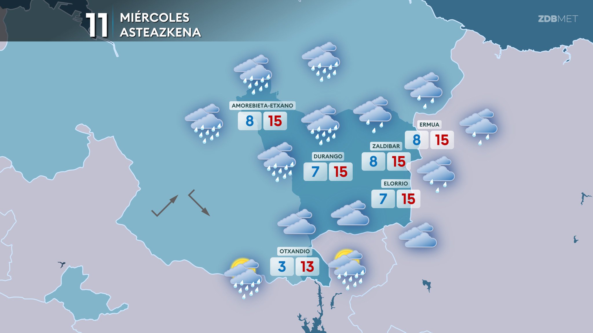 EGURALDIA | El miércoles la llegada de un frente cubrirá los cielos y dejará lluvia. De madrugada comenzará a llegar nubosidad y durante la mañana los cielos estarán ya prácticamente cubiertos. En puntos cercanos a la costa más occidental el frente comenzará a dejar lluvia ya desde la mañana, atravesando el territorio de oeste a este y afectando sobre todo a la vertiente cantábrica y por la tarde. Las temperaturas no sufrirán muchos cambios. Viento del suroeste, que girará a noroeste en torno al mediodía o por la tarde.