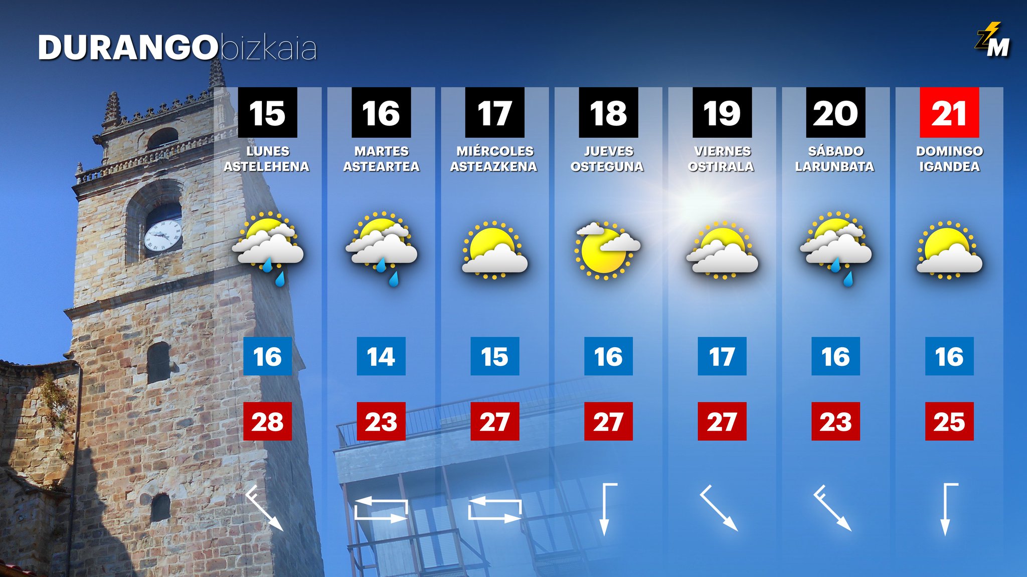 El lunes, con la llegada de un debilitado frente frío, la nubosidad será mayor. Comenzaremos la mañana con viento del suroeste y temperaturas bastante altas. Al final de la mañana, sin embargo, el viento girará bruscamente a noroeste, con rachas fuertes. Refrescará y la nubosidad aumentará, sobre todo las nubes bajas en el norte. En el sur estará más soleado. Se producirán también algunos chubascos dispersos, tanto en el norte como en el sur, donde podrían ser localmente tormentosos durante la tarde. Temperaturas máximas sin grandes cambios, aunque con el paso del frente irá refrescando.