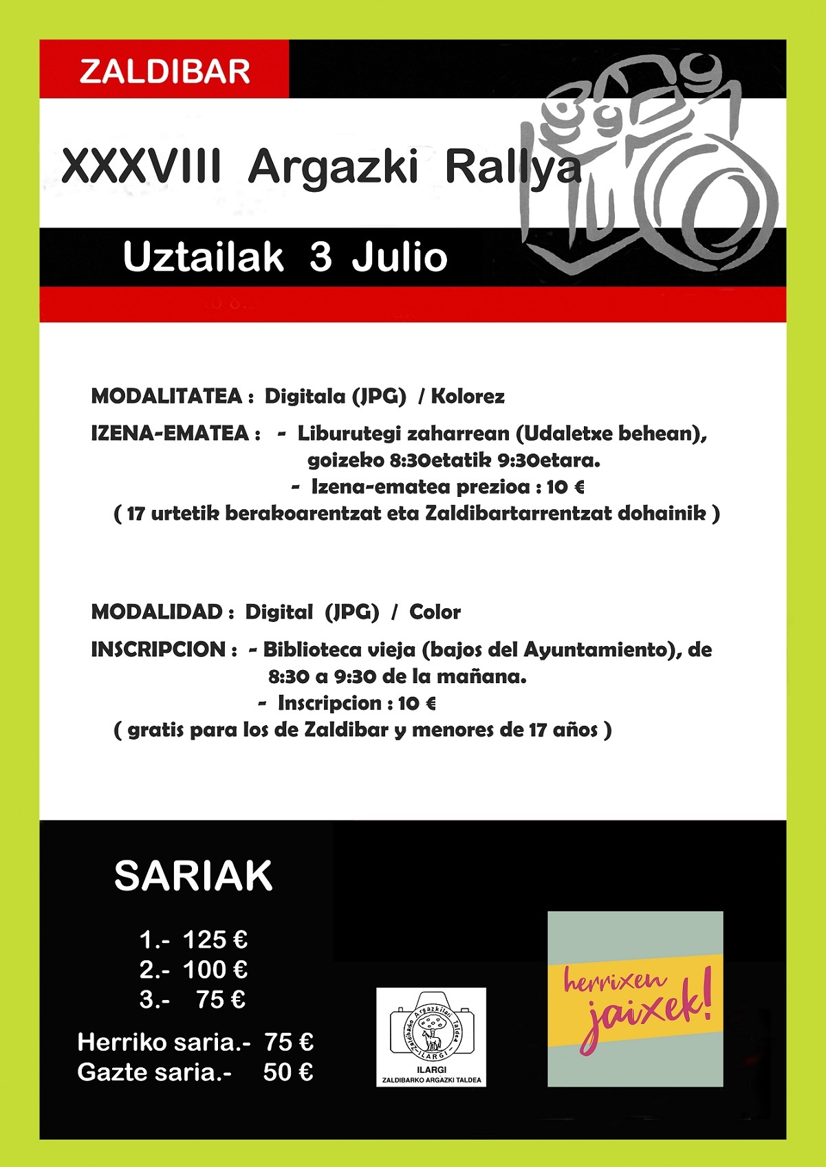 ZALDIBAR | Este próximo domingo la localidad zaldibatarra organiza una rallye fotográfico. Los inetersados deberán inscribirse este domingo de 8:30 a 9:30 horas en los bajos del ayuntamiento. Se repartirán tres premios de 125 euros, 100 euros y 75 euros.